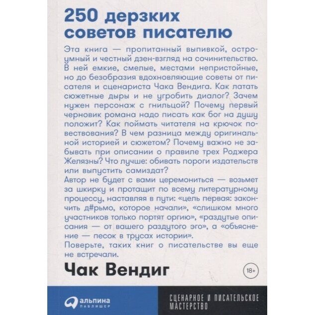 «250 дерзких советов писателю» — это пропитанный выпивкой, остроумный и честный дзен-взгляд на сочинительство. В книге емкие, смелые, местами непристойные, но до безобразия вдохновляющие советы от писателя и сценариста Чака Вендига. Как латать сюжетные дыры и не угробить диалог? Зачем нужен персонаж с гнильцой? Почему первый^ черновик романа надо писать как бог на душу положит? Автор не будет с вами церемониться — возьмет за шкирку и протащит по всему литературному процессу, наставляя в пути: «цель первая: закончить д#рьмо, которое начали», «слишком много участников только портят оргию», «раздутые описания — от вашего раздутого эго», а «объяснение — песок в трусах истории». Поверьте, таких книг о писательстве вы еще не встречали.