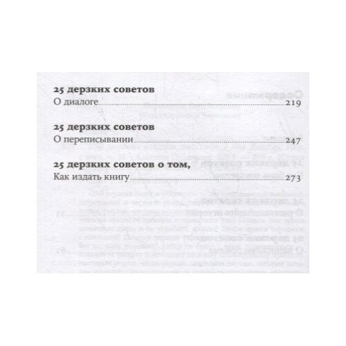 Книга "250 дерзких советов писателю" - это не учебник о писательстве, не наставления, не поучения. Я бы сказала, что это переработка автором прописных "истин", его взгляд на ту или иную установку, которые обычно дают в учебниках. Книга поделена на 11 тематических частей, а каждый совет вынесен отдельно на страницу, даже если он состоит из 2-3 строчек. В плане советов я не нашла для себя ничего нового, так как уже читала несколько книг-учебников. Сборник советов Вендинга был мне любопытен как отображение его личного восприятия. Всегда интересны разные точки зрения и отношения писателей к своему делу, процессу сочинительства и тем более к "истинам".