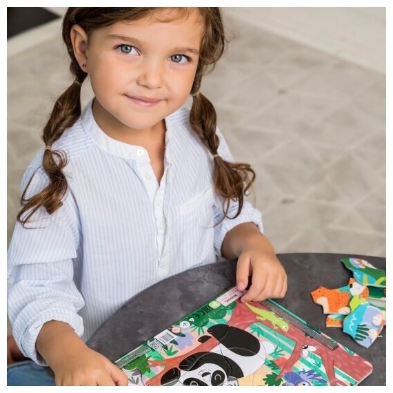 Пазл "Панды" состоит из 21 элемента и основной рамки-шаблона. Задача малыша: заполнить рамку недостающими фрагментами мозаики. В процессе игры активно работает логическое мышление, наглядное и образное восприятие, фантазия и воображение, мелкая моторика рук, внимательность и аккуратность.