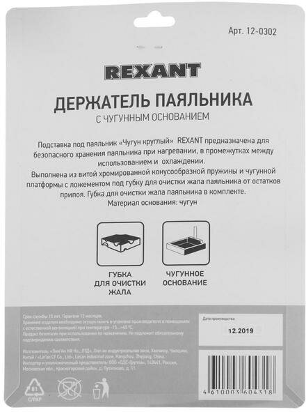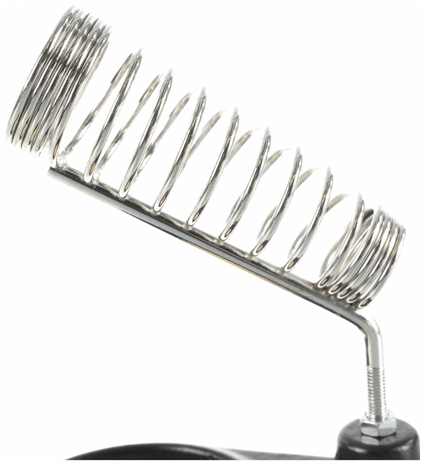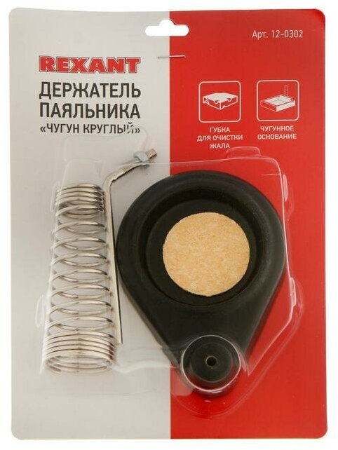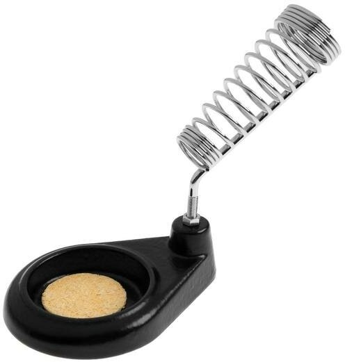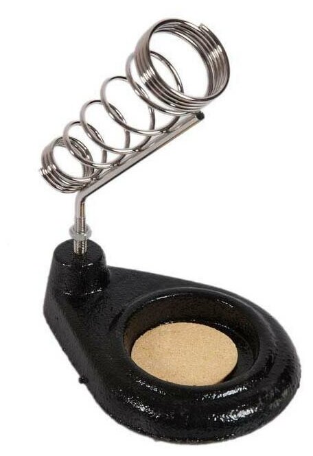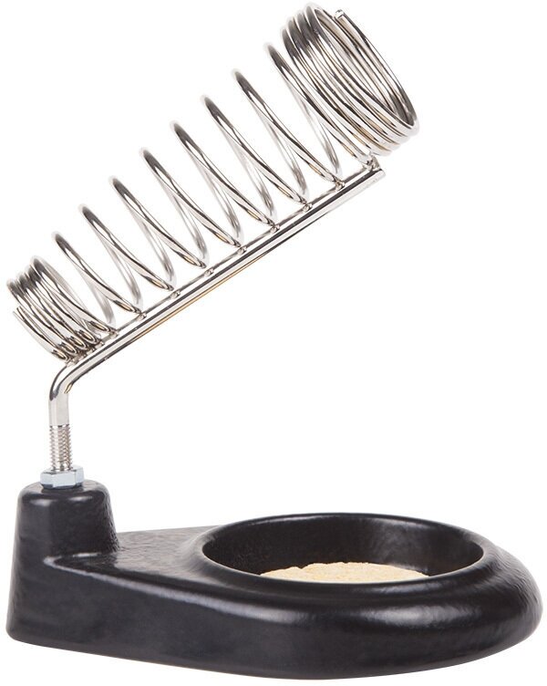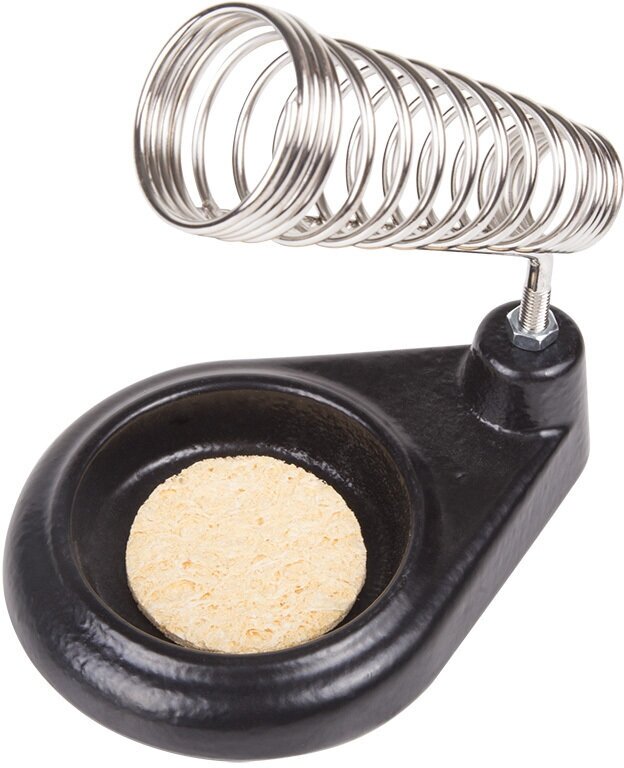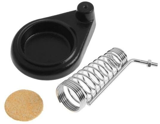 Выполнена из витой хромированной конусообразной пружины и чугунной платформы с ложементом под губку для очистки жала паяльника от остатков припоя. Губка для очистки жала паяльника в комплекте.