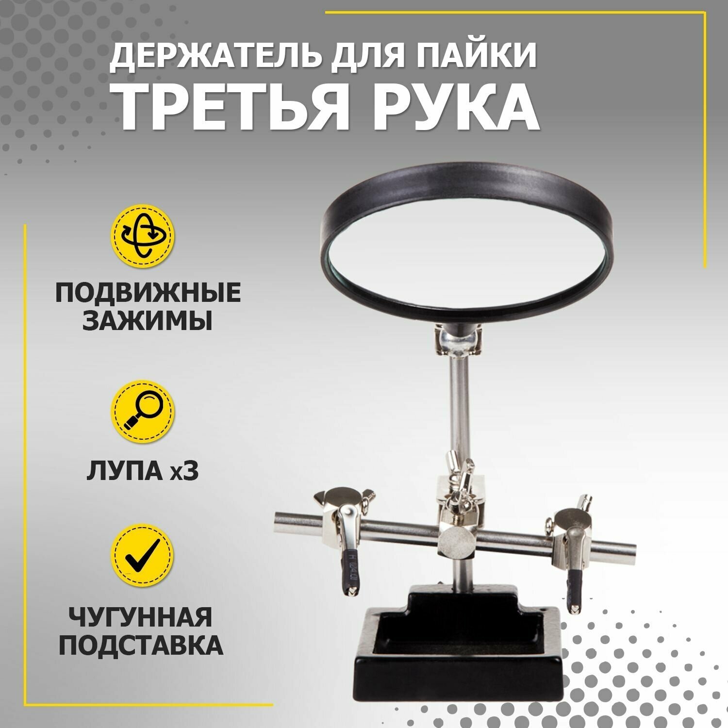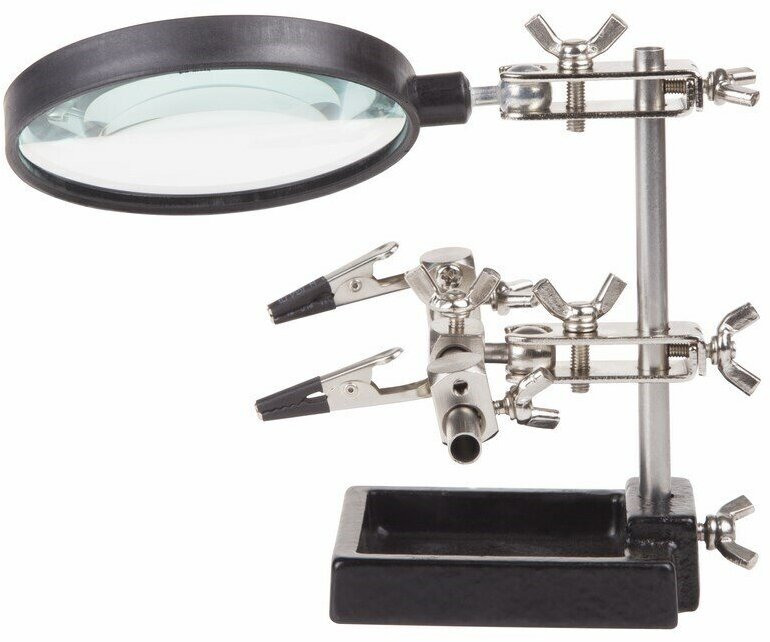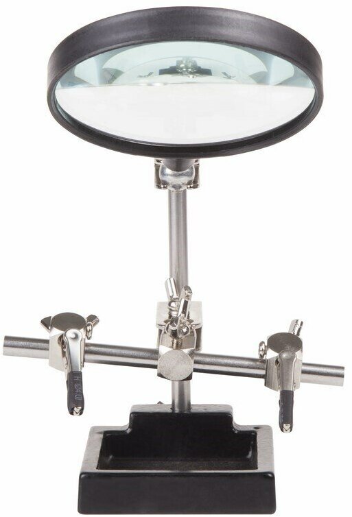 Третья рука идеальный помощник, при работе с мелкими деталями,когда не хватает двух рук. Модель с 3-кратным увеличением (возможность регулировки положения, диаметр линзы 90 мм). С помощью лупы можно будет рассмотреть даже самые мелкие детали.