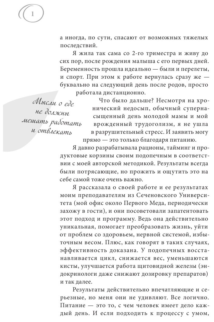 С Натали знакома давно и уже давно применяю её подходы на себе, поэтому нового было не так много, но все же новую информацию для себя выделила, плюс для меня книга больше получилась как разговор с психологом, чем с диетологом. Для людей, которые только начинают свой путь к перестройке организма на правильное питание, книга подойдёт,главное применять всё то, о чем говорит автор. Много полезной информации: влияние продуктов на организм, классификация продуктов по группам, биоритмы, есть рецепты - быстро и полезно. Написано простым языком, читается легко, прочитала быстро. Каждый в этой книге найдёт что-то для себя, смотря какой запрос.
