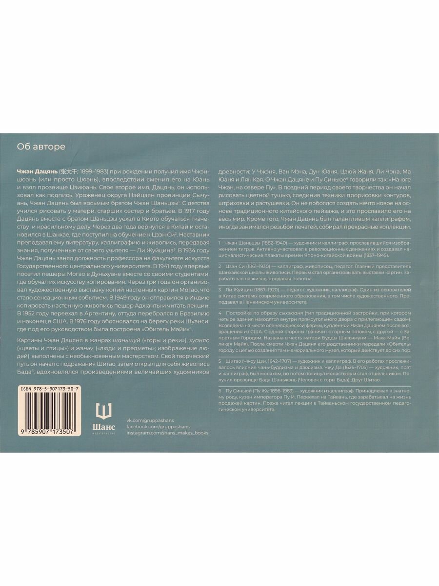 Чжан Дацянь (1899-1983) при рождении получил имя Чжэн-цюань (или просто Цюань), впоследствии сменил его на Юань и взял прозвище Цзиюань. Свое второе имя, Дацянь, он использовал как подпись. Уроженец округа Нэйцзян провинции Сычуань, Чжан Дацянь был восьмым братом Чжан Шаньцзы. С детства учился рисовать у матери, старших сестер и братьев. В 1917 году Дацянь вместе с братом Шаньцзы уехал в Киото обучаться ткачеству и красильному делу. Через два года вернулся в Китай и остановился в Шанхае, где поступил на обучение к Цзэн Си. Наставник преподавал ему литературу, каллиграфию и живопись, передавая знания, полученные от своего учителя-Ли Жуйцина. В1934 году Чжан Дацянь занял должность профессора на факультете искусств Государственного центрального университета. В1941 году впервые посетил пещеры Могао в Дуньхуане вместе со своими студентами, где обучал их искусству копирования. Через три года он организовал художественную выставку копий настенных картин Могао, что стало сенсационным событием. В1949 году он отправился в Индию копировать настенную живопись пещер Аджанты и читать лекции. В 1952 году переехал в Аргентину, оттуда перебрался в Бразилию и наконец в США. В1976 году обосновался на берегу реки Шуанси, где под его руководством была построена "Обитель Майи".