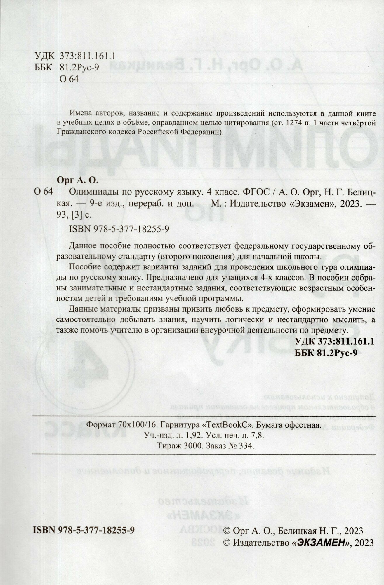 Олимпиады по русскому языку. 4 класс. издание восьмое переработанное и дополненное. фгос. (Орг Александр Оскарович; Белицкая Наталья Георгиевна); Экзамен, 2023