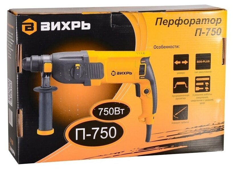 Прочие особенности и свойства | Перфоратор Вихрь П-750 рассчитан на работу с любыми видами материалов. Универсальность применения обеспечивается за счет наличия 3 режимов работы, настройки углового положения, реверсного хода, регулировки частоты вращения.,,Электрический двигатель мощностью 750 Вт расположен горизонтально, его мощность составляет 750 Вт. Перфоратор можно использовать в режиме удара, сверления с ударом и обычного сверления отверстий максимальным размером 13/26/40 мм в стальной, бетонной, деревянной поверхности. Функция удара (2,8 Дж) позволяет легко справиться с твердыми породами, бетоном, кирпичом. Частоту ударов можно подбирать в зависимости от типа материала в диапазоне от 0 до 5200 уд/мин. Частота вращения также может регулироваться 0-1100 об/мин. Реверсный ход упростит высвобождение застрявшей в поверхности оснастки. Для удобства использования корпус оснащен прорезиненной антискользящей ручкой, ограничителем глубины отверстия, блокировкой выключателя, защитой от проникновения пыли.,,Надежная, удобная в эксплуатации, многофункциональная модель Вихрь П-750 станет незаменимым помощником в быту. Она легко справится со сверлением и штроблением поверхностей из твердых материалов, поможет сократить время ремонтно-строительных работ.,Патрон SDS-plus для простой смены оснастки,Регулировка частоты вращения - для точной настройки под разные материалы,Поворотный щеточный узел (мощность в рабочем режиме и режиме реверса не изменяется),Предохранительная муфта для защиты оператора от эффекта отдачи,Прорезиненная накладка на рукоятке способствует удобному удержанию инструмента и не дает рукам скользить, что важно при продолжительной работе |