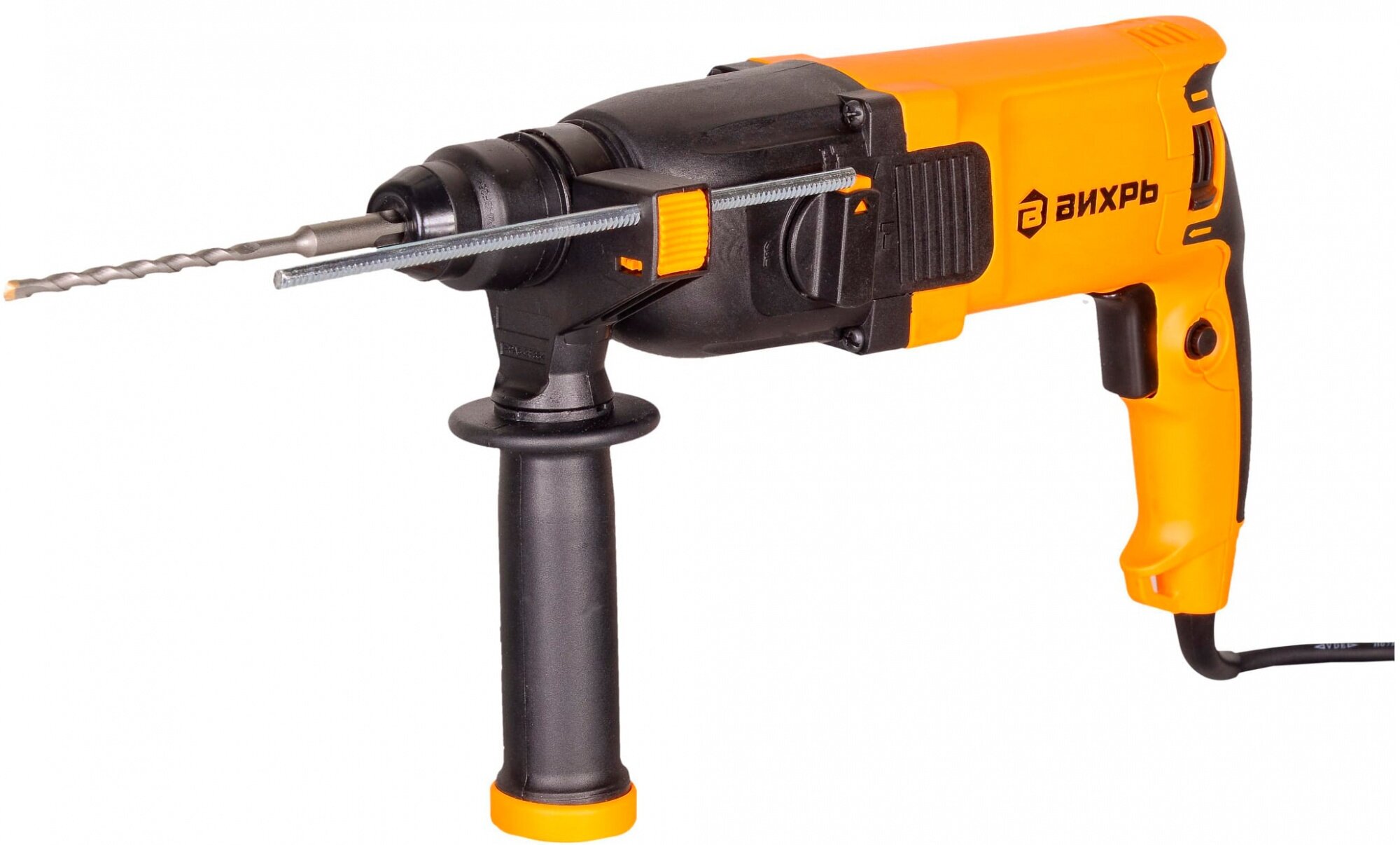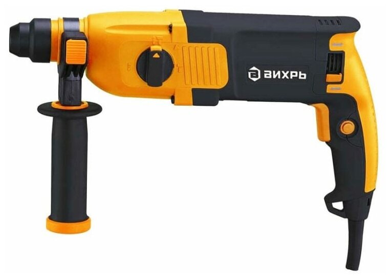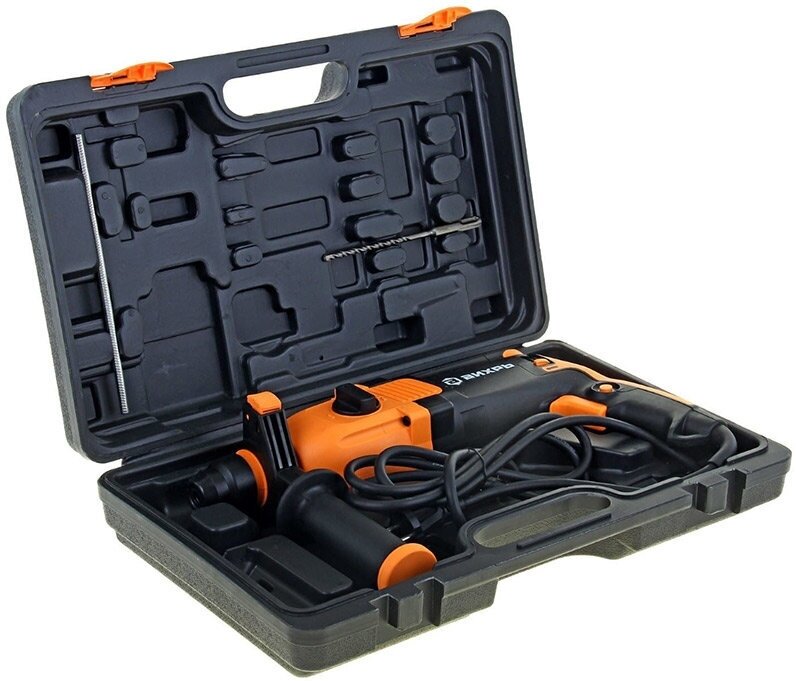 Перфоратор ВИХРЬ – электроинструмент, аналогичный дрели, но с наличием не механического, а пневматического ударного механизма. Именно поэтому перфоратор используют для сложных работ по твёрдым материалам - бетону, кирпичу, металлам. Агрегат используется для сверления и пробивания отверстий в прочных материалах без приложения особых физических усилий со стороны оператора. Принцип работы перфоратора – это разрушение обрабатываемого материала с помощью поступательных и вращательных действий рабочего элемента. Состоит перфоратор из электрического двигателя, редуктора, ударного механизма и патрона для крепления рабочих инструментов (буры, коронки, зубила и т.д.).