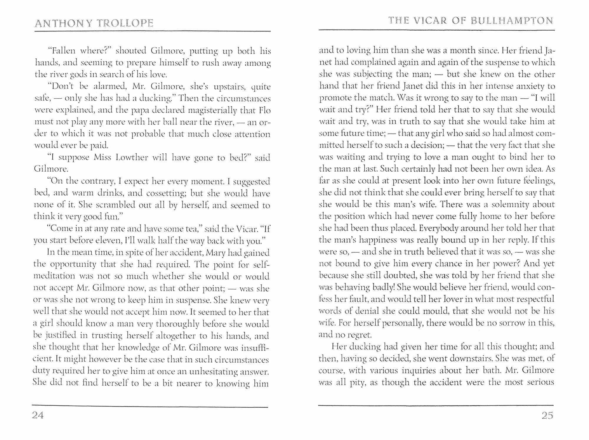 Anthony Trollope (1815-1882) was an English novelist of the Victorian era. Among his best-known works is a series of novels collectively known as the Chronicles of Barsetshire, which revolves around the imaginary county of Barsetshire. "The Vicar of Bullhampton" is a novel which is made up of three intertwining subplots: the courtship of a young woman by two suitors; a feud between the titular Broad church vicar and a Low church nobleman; and the vicar's attempt to rehabilitate a young woman who has gone astray.
