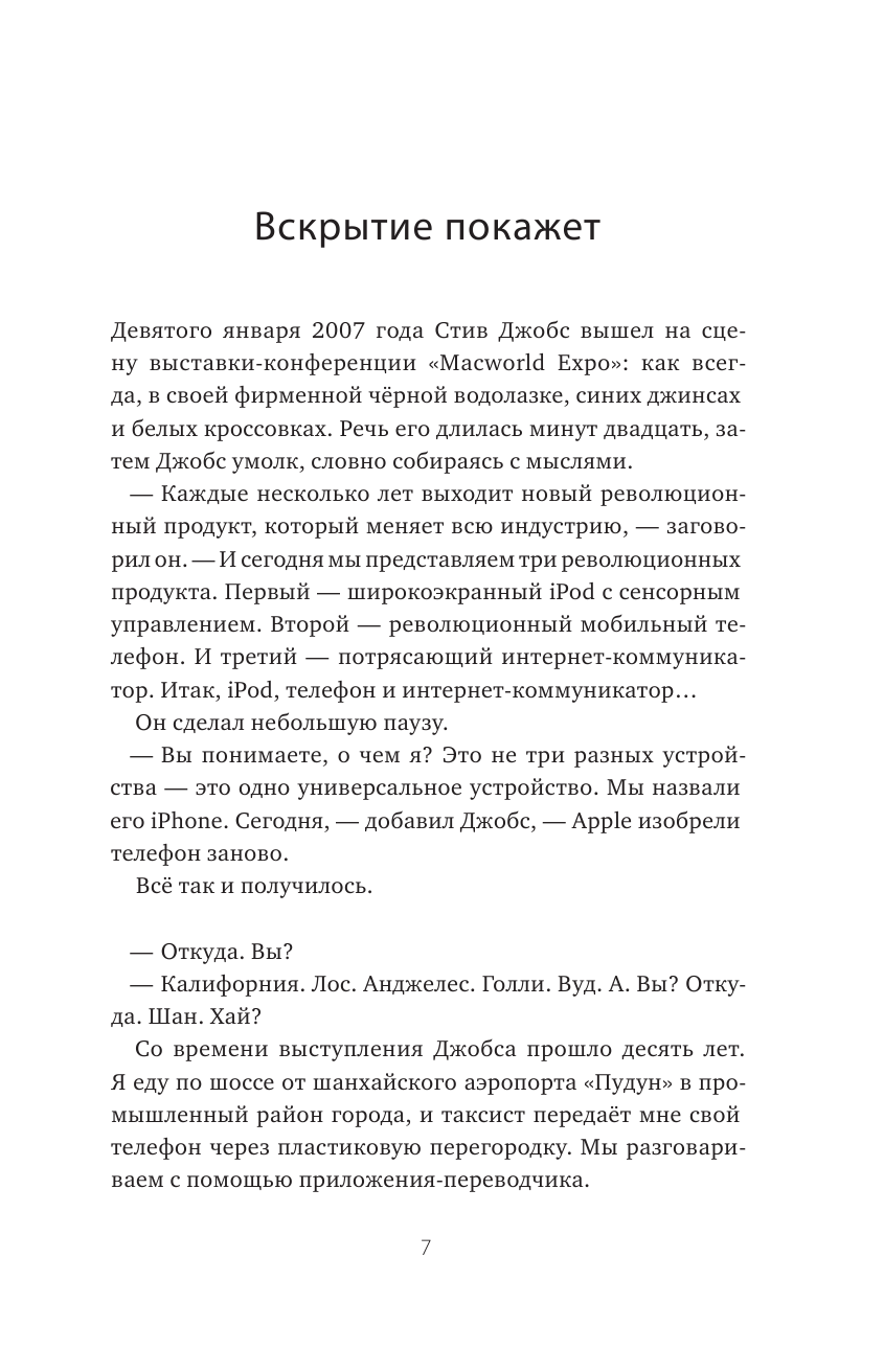 9 января 2007 года Стив Джобс презентовал iPhone, ставший технологическим и экономическим феноменом. Самый успешный продукт Apple, годовые продажи которого достигли миллиарда! Что же стоит за созданием этого технологического "чуда", без которого ни один современный человек уже не может представить свою жизнь? Компания Apple хранит эту информацию в секрете, транслируя причесанную, урезанную и отредактированную официальную версию, оставляющую без ответа все интересующие нас вопросы. Именно поэтому автор книги провел собственное расследование - пообщался с ведущими инженерами Apple и лично проследил весь путь iPhone: от идеи до воплощения, из Пало-Альто - в Шанхай, из Китая - по всему миру. В результате получилась неожиданная и захватывающая история появления удивительного "универсального устройства", как охарактеризовал его 11 лет назад Стив Джобс.