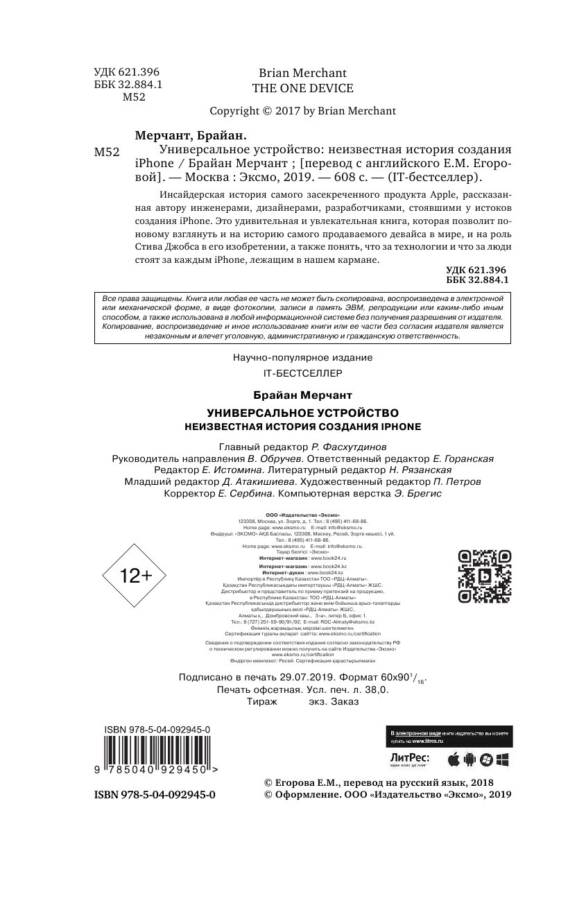 Универсальное устройство. Неизвестная история создания iPhone (Мерчант Брайан); ООО "Издательство "Эксмо", 2019