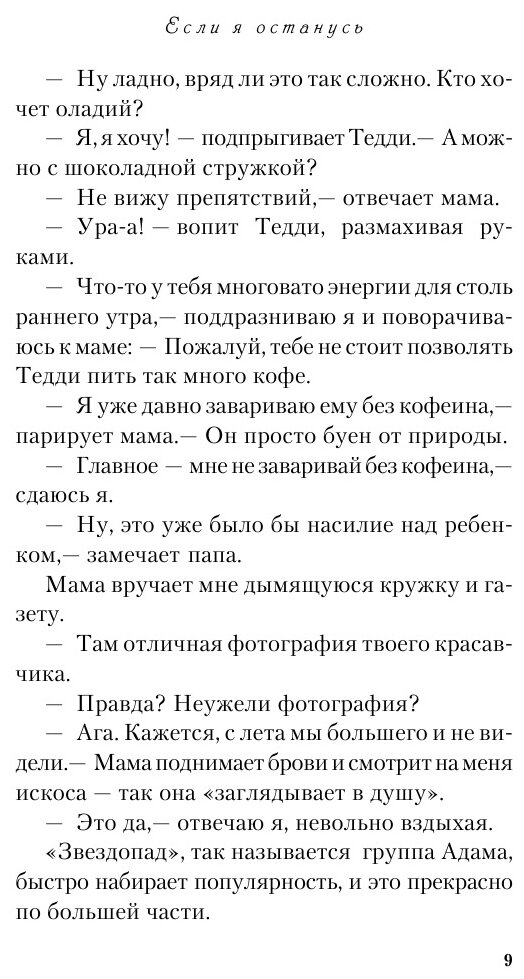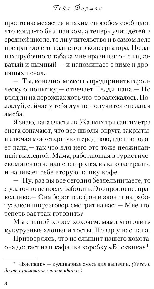 Эту книгу сравнивают с романом Элис Сиболд "Милые кости", самым поразительным бестселлером начала XXI века, по единодушному мнению критики. Хотя общая у них только канва: и здесь, и там душа юной девушки, расставшись с телом, наблюдает со стороны за жизнью близких людей. Но в случае с героиней книги Гейл Форман, семнадцатилетней Мией, дело обстоит много сложнее. Судьба поставила ее перед выбором - или вернуться к жизни, или навсегда уйти в мир иной, последовав за самыми любимыми для нее людьми.