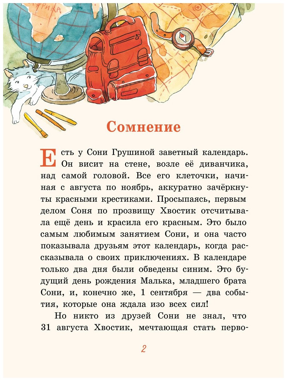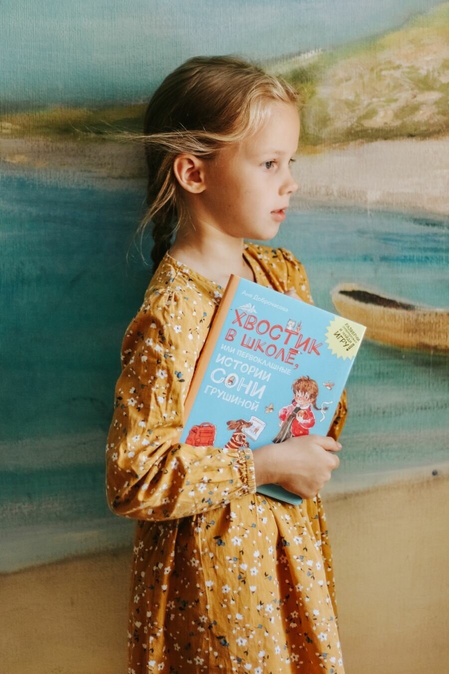 Соня Грушина, она же Хвостик дома, она же первоклашка). И эта книга истории о ней. О том, как она хотела, но передумала идти в школу. О самолетиках и зародившейся дружбе. О талантах и надоевшем дневнике, который был удачно спрятан, но неудачно найден соседкой в почтовом ящике. О волшебной луже и интересных местах по пути в школу.