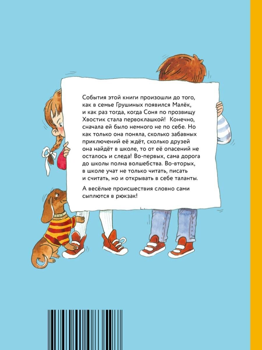 Вот и настал тот день, когда Соня Грушина по прозвищу Хвостик стала первоклашкой! Конечно, сначала ей было немного не по себе. Но как только она поняла, сколько забавных приключений её ждёт, сколько друзей она найдёт в школе, то от её опасений не осталось и следа! Во-первых, сама дорога до школы полна волшебства. Во-вторых, в школе учат не только читать, писать и считать, но и открывать в себе таланты. А весёлые происшествия словно сами сыплются в рюкзак!