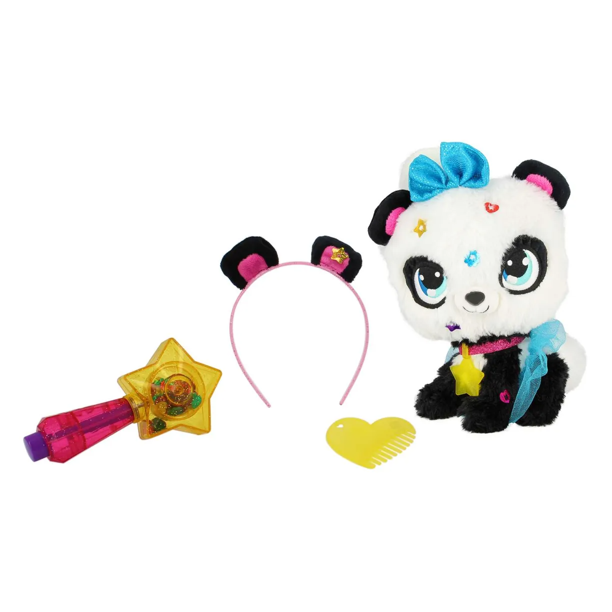 Очаровательная плюшевая панда с большими голубыми глазами и розовыми ушками. Игрушка украшена блестящим бантиком и ошейником со звездочкой. С помощью шиммерайзера можно добавить на шерстку питомца блестки. Шерстку можно расчесывать.