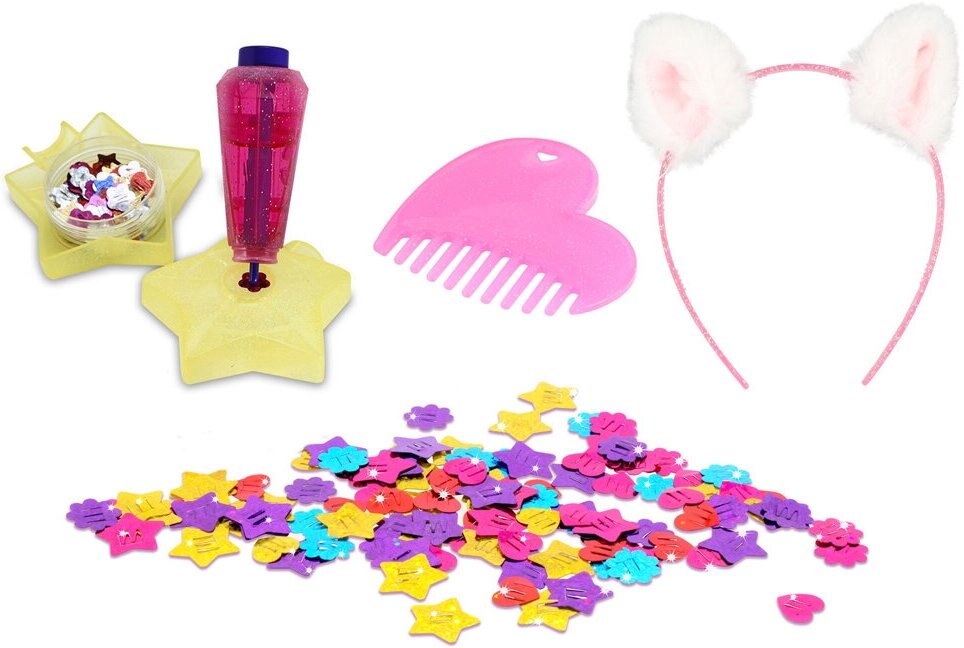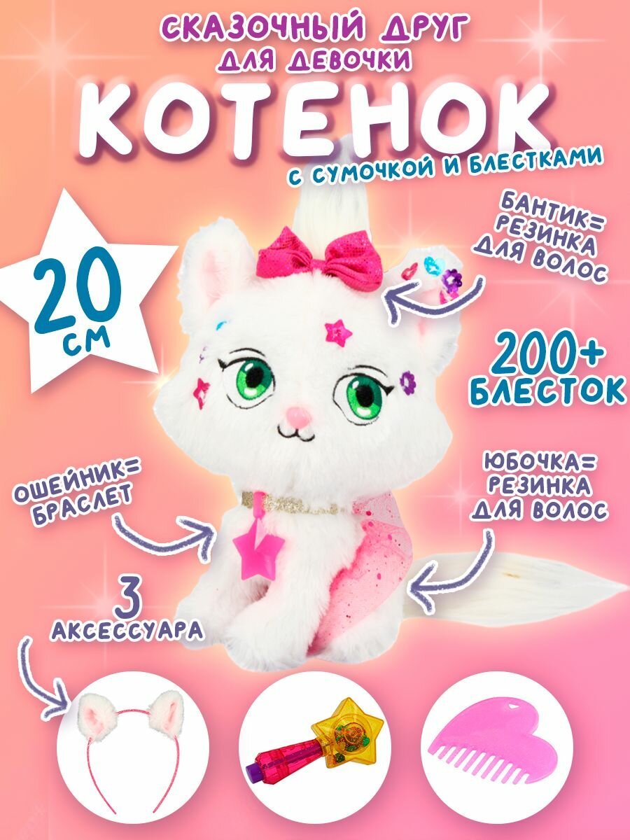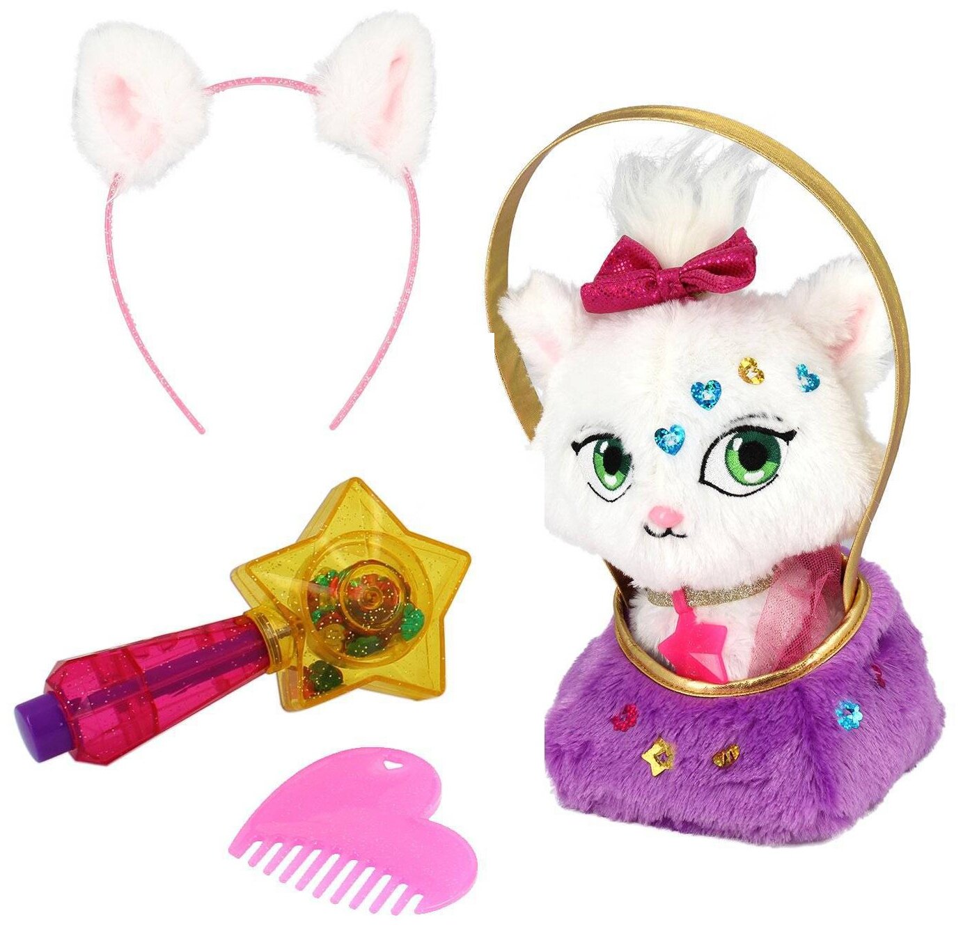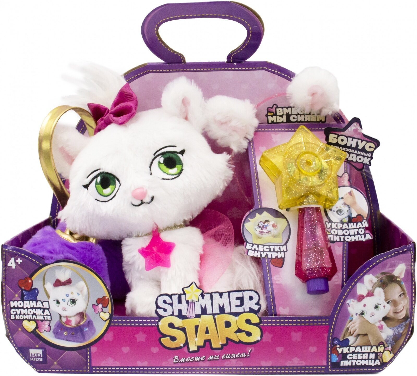 Комплект: плюшевый котенок, сумочка для игрушки и ребенка, шиммерайзер (аксессуар для нанесения и хранения блесток), 200+ блесток, расческа, ободок для девочки, 3 аксессуара, которые подойдут и для ребенка, и для игрушки: эластичная резинка с бантиком; сверкающий ошейник со звездочкой, который можно использовать как браслет; юбочка для питомца, которую можно использовать как аксессуар для волос.