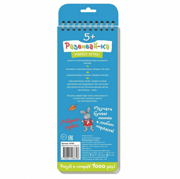 Благодаря специально подобранным картинкам-образам и развивающим заданиям многоразовые прописи помогут ребёнку быстро запомнить все печатные буквы русского алфавита, освоить их написание, провести работу над ошибками и сформировать красивый и аккуратный почерк.