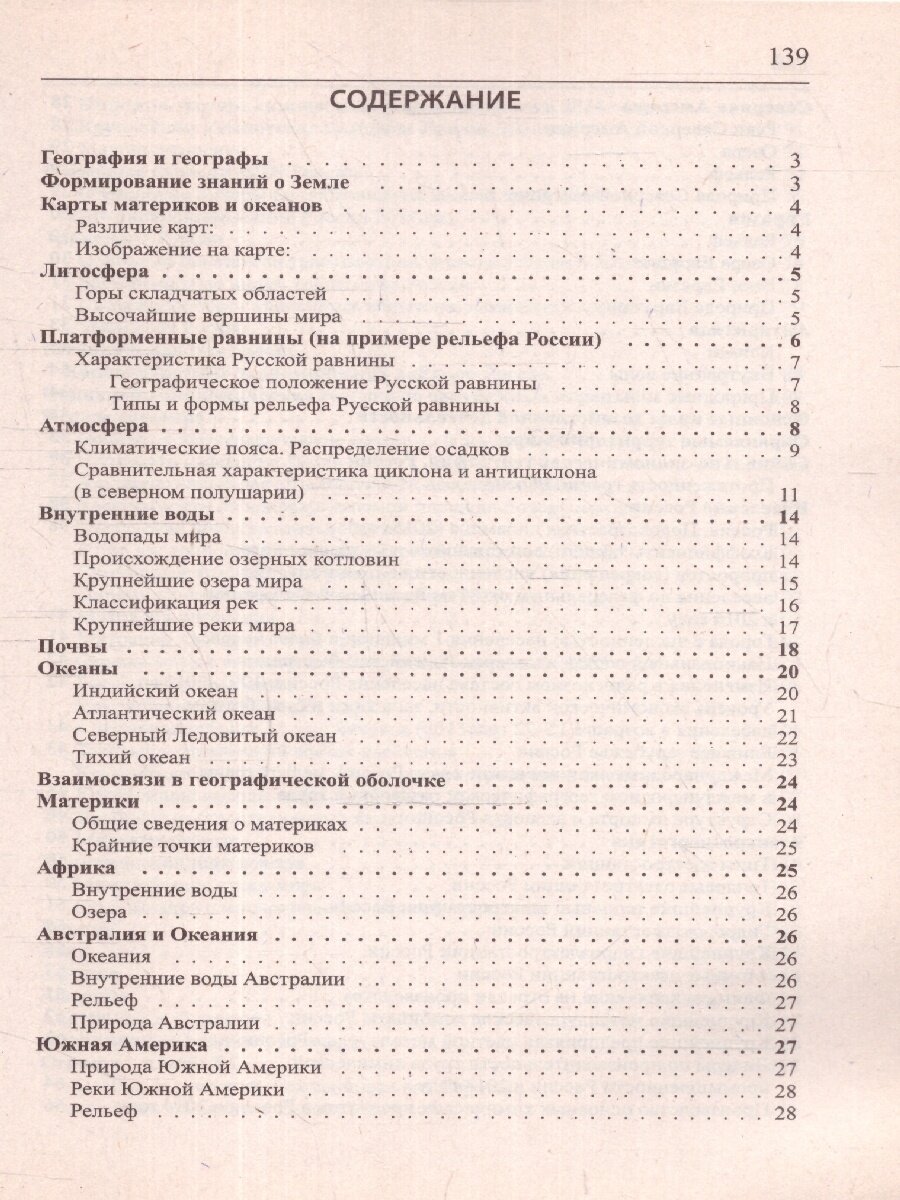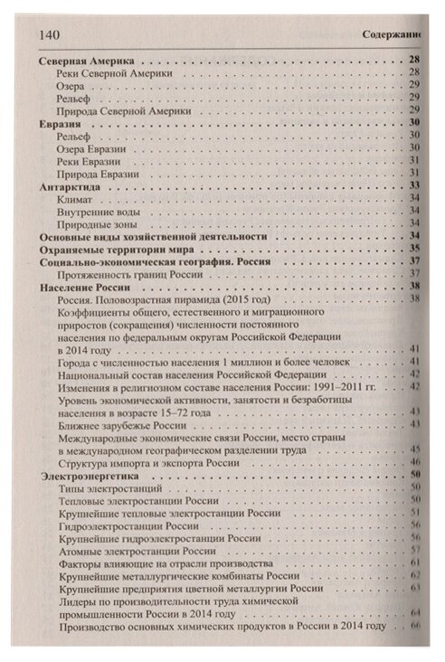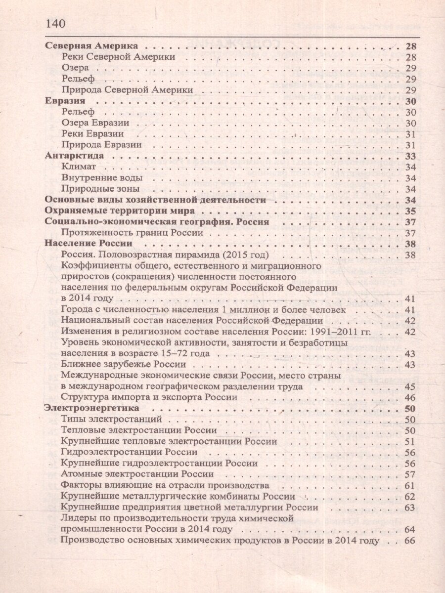 Включает в себя информацию по школьному курсу картографии, литосфере, характеристики регионов России (и физические и экономические данные). Также есть информация по географии материков и океанов. Часть сборника посвящена экономической географии РФ и мирового хозяйства.