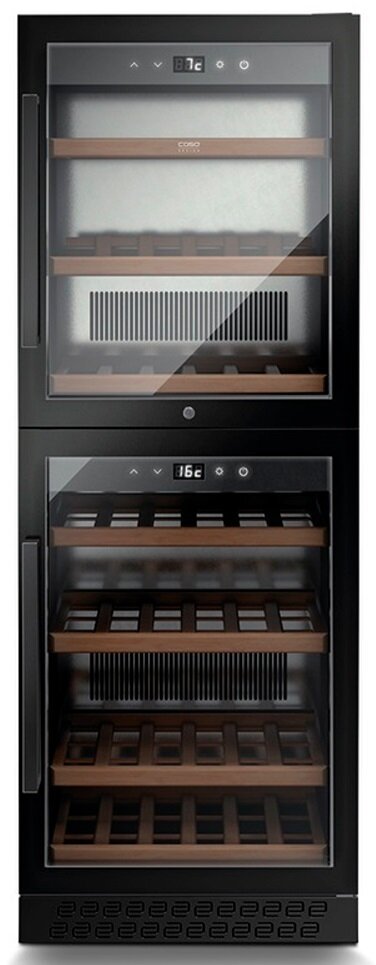 Винный шкаф CASO Pro 126-2D состоит из двух отдельных зон и предназначен для охлаждения вин и поддержания заданной температуры хранения напитков. В основу устройства заложена компрессорная система охлаждения, а зонирование предполагает раздельное изолированное хранение разных видов вина – белого и красного (верхняя и нижняя зоны соответственно).