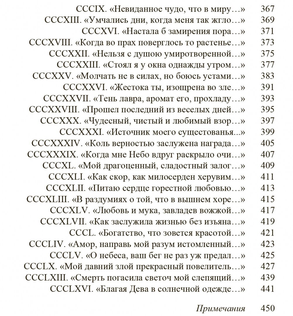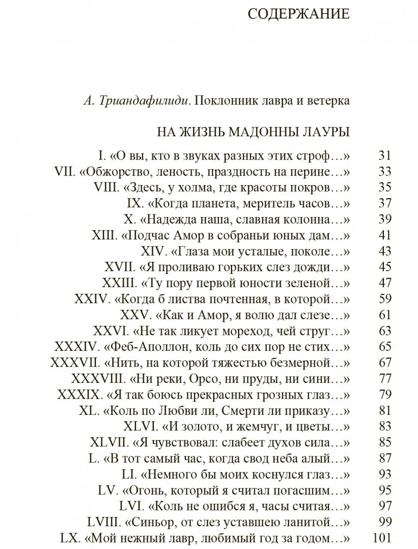 Эта замечательная книга - плод титанического труда Александра Триандафилиди, который уже подарил русской словесности несколько замечательных книг зарубежной классической поэзии. Его переводческий стиль отличается глубоким проникновением в смысл и дух оригинала, которые он передаёт эквиметрическим стихом в полном соответствии с лучшими традициями поэтического перевода, которыми давно и заслуженно гордится русская литература. Читатель этой книги погрузится в "единый и неделимый" мир поэзии Петрарки, любовно воссозданный переводчиком с такой точностью, что, сравнивая перевод с оригиналом (счастливое свойство билингвы), читатель может совершенствовать свои познания в итальянском языке за счёт блестящим образом сохранённого соответствия строк. При этом переводчик, как и обещал в предисловии, вовсе не впадает в буквализм. Его язык сочен, пластичен, в меру современен и, тоже в меру, архаичен. Он безупречно владеет методами передачи итальянской силлабики средствами русской поэзии. Его рифмы точны и удивительно разнообразны.