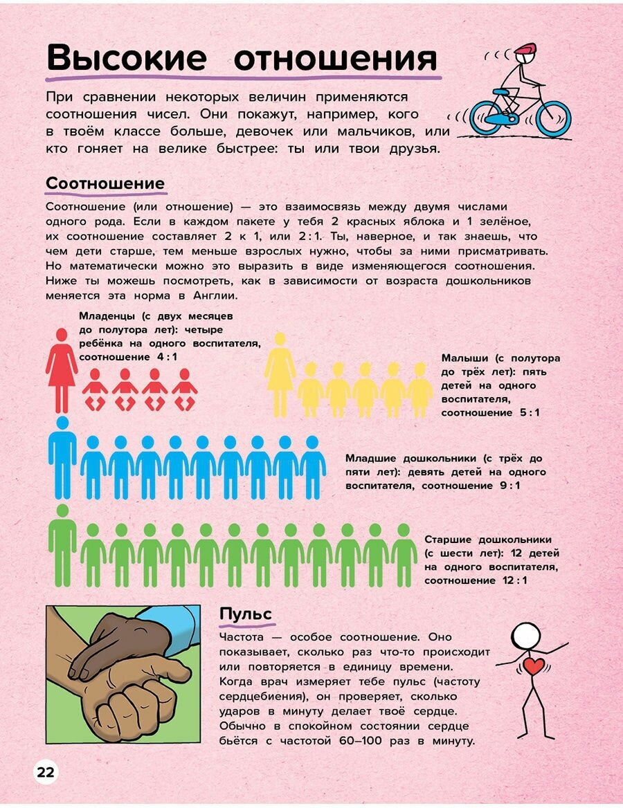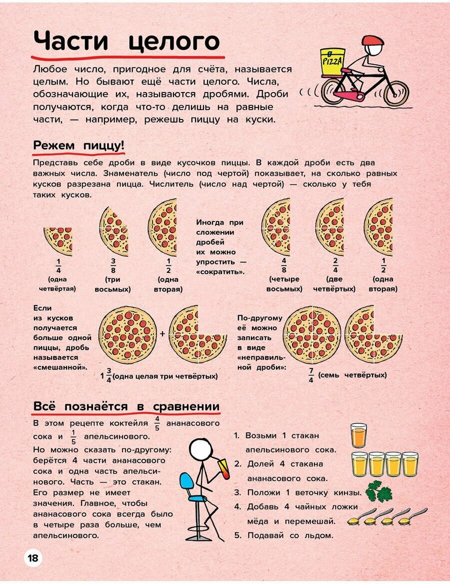 Книга мне нисколько не понравилась. Разбираются, например дроби, на примере кусочков пиццы 1/4 или 3/8, и кусочки пиццы разделенной на 8 частей нарисованы. Начинается книга вообще с объяснения что такое сложение и вычитание, на примере носков, было у тебя 3 носка, прибавили 2, сколько стало. В следующей главе разбирается умножение, опять же на примере носков, сколько тебе надобится носков на неделю, если каждый день одевать новую пару носков 2+2+2+2... и так семь раз. Дальше показаны диаграммы круговые и столбиками, предлагается опросить своих одноклассников, какой у них любимый цвет и составить диаграмму столбиками. Что в книге и сделано. Большинство того, что в книге описано - наэлементарнейшие сведения, ребенку даже среднего школьного возраста книга будет неинтересна. Я думала, что книга рассчитана на средний школьный возраст и, что даже я узнаю из неё какие-то интересные сведения, ничего занимательного, примитивные вещи разобраны. Я вспомнила уже после приобретения книг, что от кого то слышала, что детские научно-популярные издания издательства "Хоббитека" крайне неудачны.Даже фраза на обложке "от числа пи до теории большого взрыва" подразумевает и обещает более сложную книгу. Детям помладше книга тоже, думаю, не понравится. Картинки также не особо удачного художника, художественной ценности никакой не представляют.