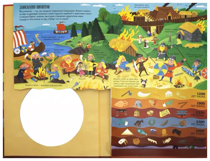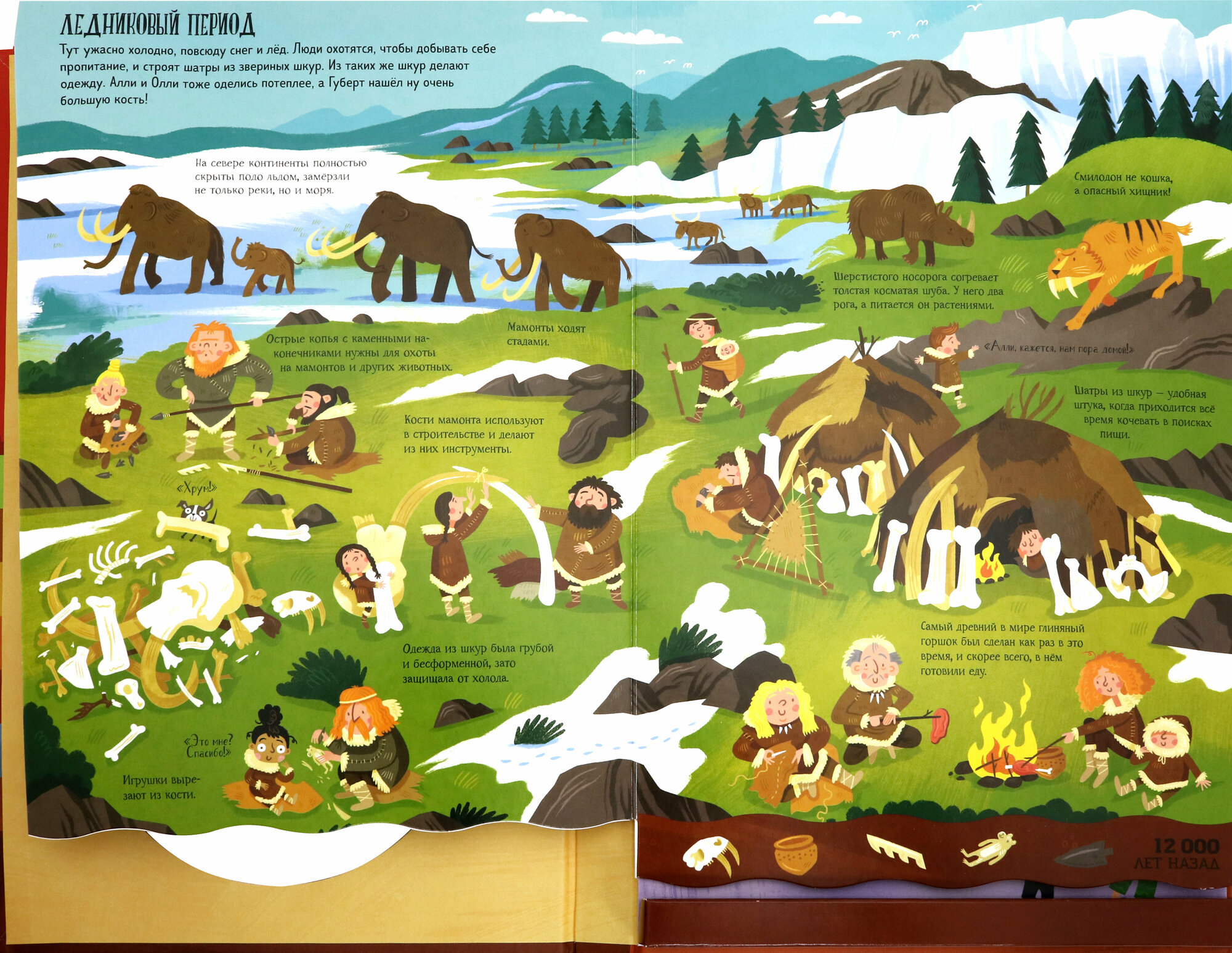 Необычная конструкция этой книги позволяет увидеть, как сменяли друг друга разные эпохи, и углубиться в историю до самого ледникового периода. Вместе с Алли, Олли и непоседливым Губертом мы побываем на Диком Западе и в средневековой Франции, познакомимся с ацтеками и викингами, увидим Древний Рим и взберемся на Великую Китайскую стену.