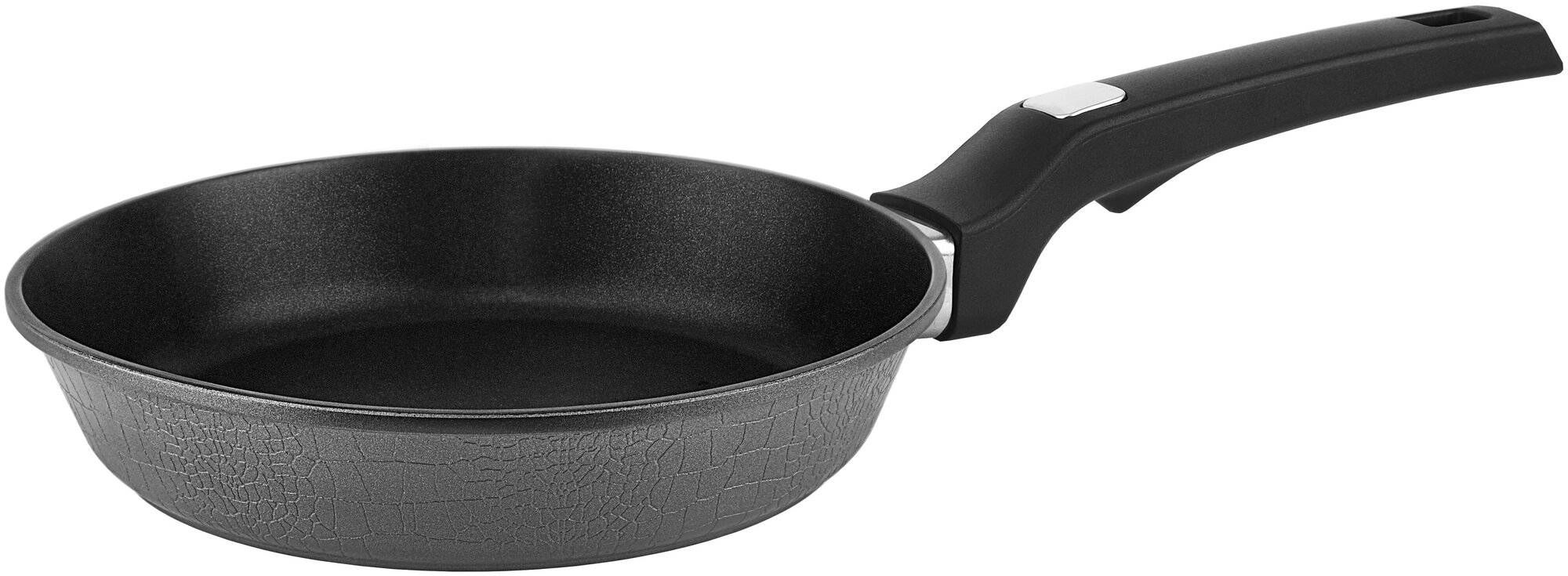 Сковородкой пользуюсь около полугода. Изначально понравился необычный внешний вид и внешняя сторона стенок оформлена под кожу крокодила что ли. Цвет серый, немаркий. Размер сковородки прекрасный , диаметр 24см. Очень нравится то, что ручка у этой сковородки съемная, и то, что внутри сковородки нет клепок в месте прикрепления ручки к стенке. Покрытие антипригарное, производителем заявлено, что можно использовать металлические лопатки при готовке и я пробовала, действительно покрытие сковороды их выдерживает. Замечаний нет, устраивает всем! Мои рекомендации!