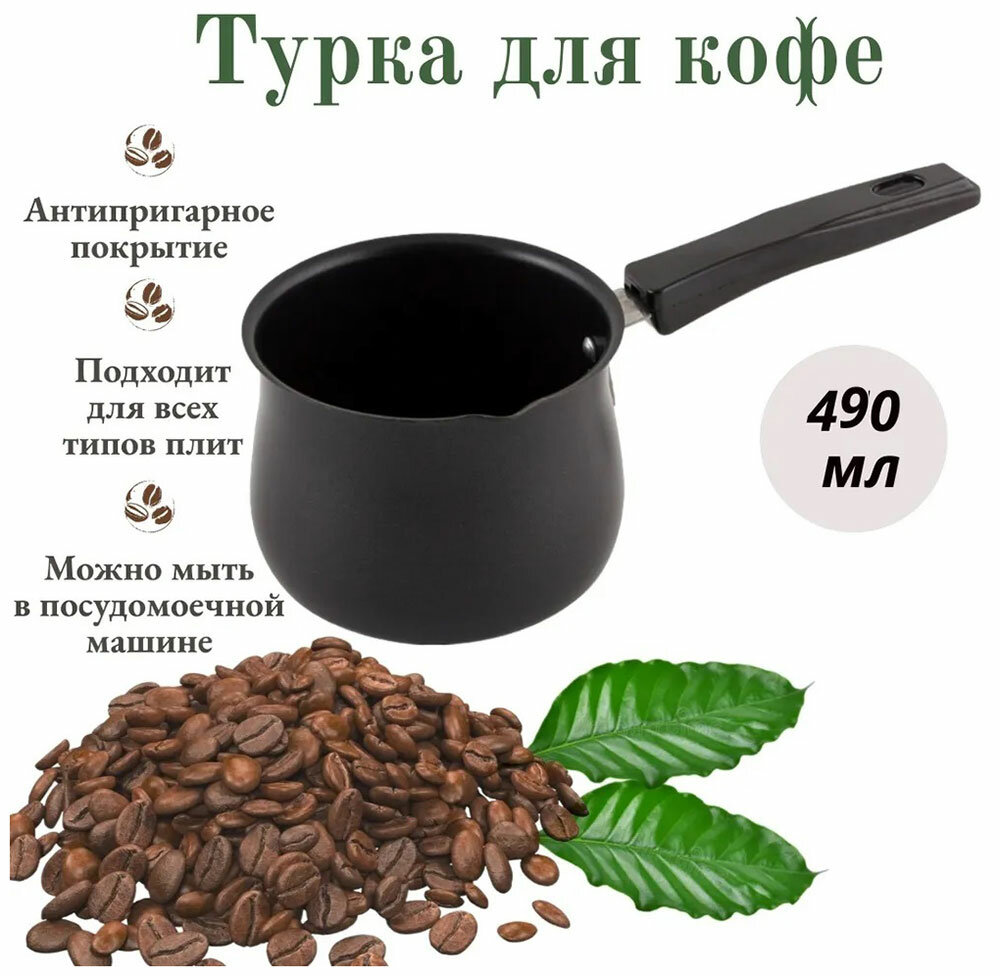 Кофеварка (турка) из карбоновой стали. Объем: 490мл. Толщина стенок - 0,8 мм. Материал: карбоновая сталь, бакелитовая ручка. Использовать на малом и среднем огне, данное изделите не следует перегревать. Можно мыть в посудомочной машине. Упаковка: стикер, пакет из пузырчатой плёнки.