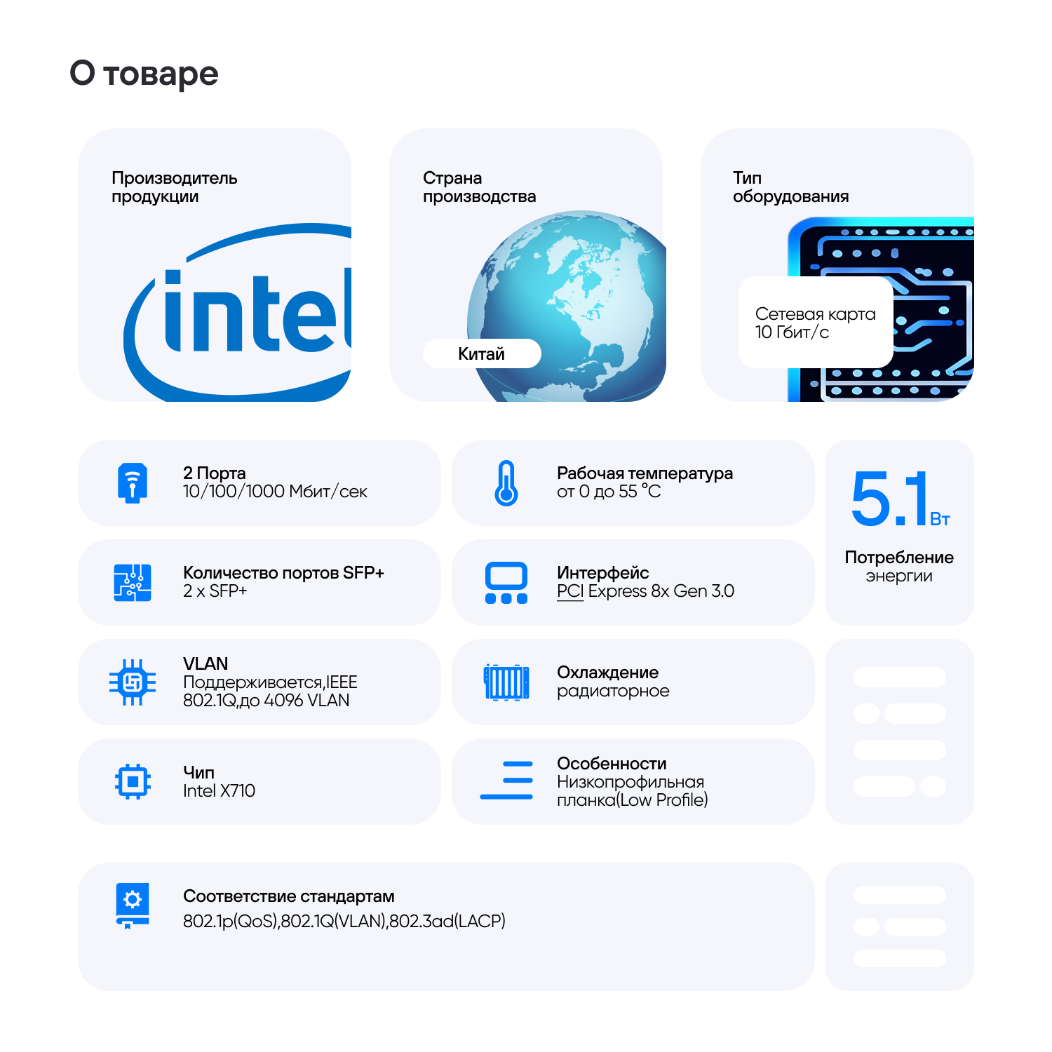 Построенная на гигабитном контроллере сетевая карта Intel , является следующим шагом в развитии сетевых функций GbE для сети и центра обработки данных предприятия. Встроенные системы QoS и управления трафиком, очереди устройств виртуальных машин VMDq, поддержка PCI-SIG SR-IOV.
