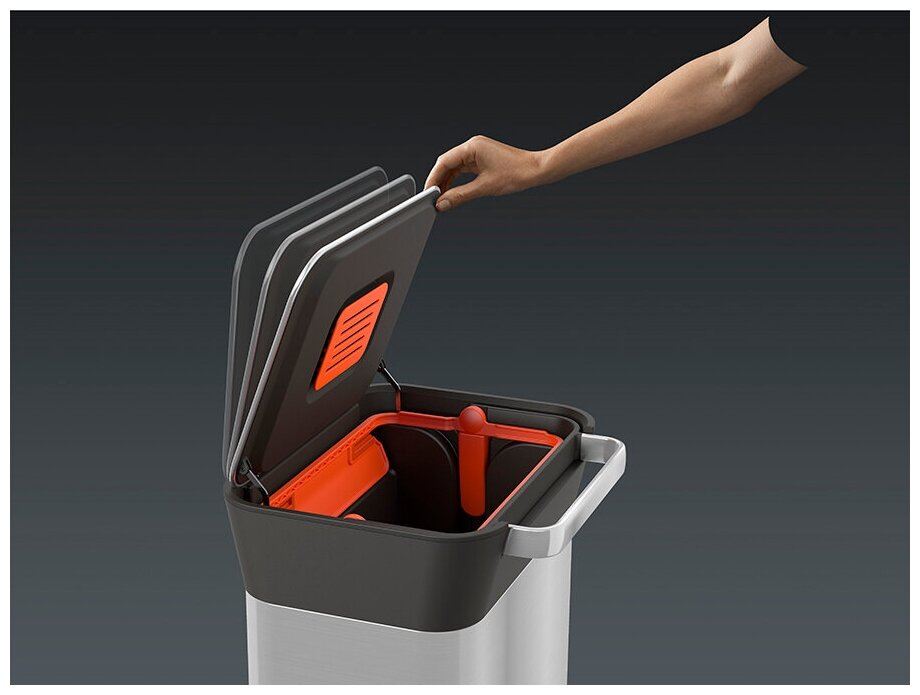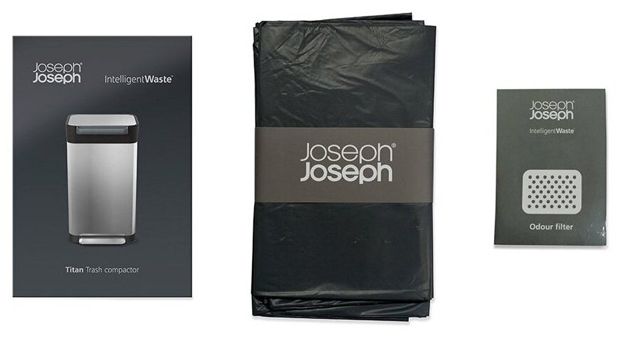 Контейнер Titan — настоящая инновация в области сортировки мусора. Гигиеничная система для уплотнения мусора повышает вместимость в 3 раза по сравнению с другими контейнерами такого же объёма. Угольный фильтр на крышке не дает неприятному запаху распространится по кухне. С помощью удобной педали отсутствует прямой контакт с мусором, при нажатии на неё бесшумно и легко открывается крышка. Пакеты для мусора теперь можно реже менять за счет утрамбовывания мусора. Конструкция плотно удерживает пакет, но не рвёт его. Это предотвращает прямой контакт с мусором. Вентиляционные отверстия дают возможность легко вынимать полный пакет. Удобство эксплуатации делает этот контейнер простым и полезным устройством, необходимым для большой семьи. Контейнер выдерживает многократную (более 100 000 раз) нагрузку при нажиме до 40 кг. Благодаря функциональному дизайну и компактным размерам контейнера экономить место на кухне стало гораздо проще. Стальной корпус и плавная форма делает его отличным дополнением любого интерьера. В комплект также входит: • Инструкция по эксплуатации • 3 специальных мусорных пакета • 1 сменный угольный фильтр Брэнд: Joseph Joseph (Англия) Материал: нержавеющая сталь, ABS, полипропилен Цвет: металлик Вес контейнера: 10,88 кг Размер в упаковке: 45,5 х 74 х 40 см Размер без упаковки: 34 х 69 х 39 см