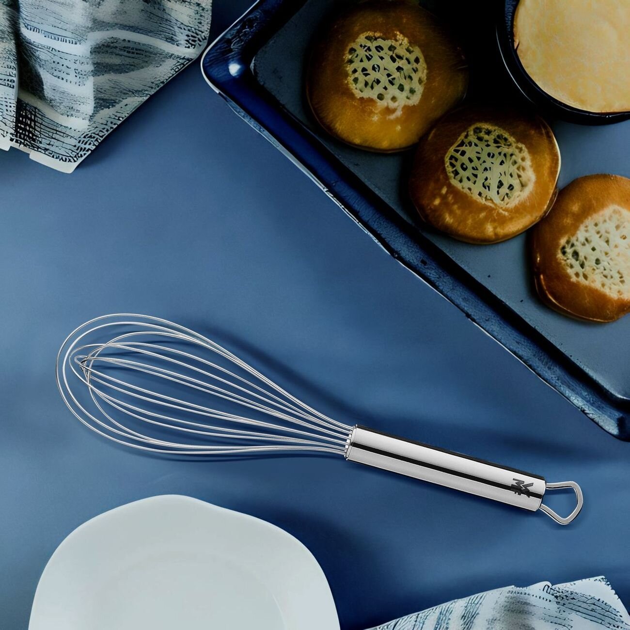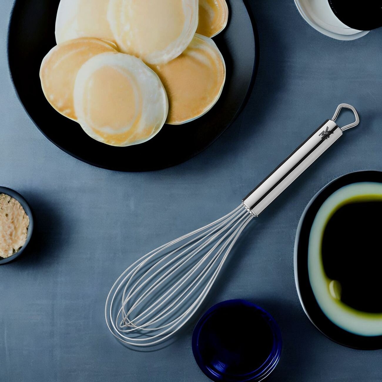 Венчик Profi Plus выполнен из нержавеющей стали 18/10 Cromargan®, которая со временем не поддается разрушению, не впитывает различные запахи и вкусы и легко чистится. Удобен в приготовлении подливки, соуса, теста, мусса, белкового крема. Благодаря небольшому ушку на конце ручки венчик можно подвесить в удобном для вас месте. Кухонные аксессуары WMF не требуют особой осторожности при эксплуатации и их можно мыть в посудомоечных машинах.