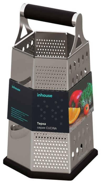 Терка с облицованной силиконом ручкой и основанием Inhouse . Легкий и удобный корпус с сатиновым покрытием. Рабочие поверхностности с различными конфигурациями ножей дают возможность быстро натереть и нашинковать различные продукты. Высокая степень заточки всех режущих элементов. Эргономичная ручка с облицовкой из силикона. Нескользящий силиконовый протектор на основании предотвращает скольжение во время использования и защищает кухонные поверхности от повреждений.