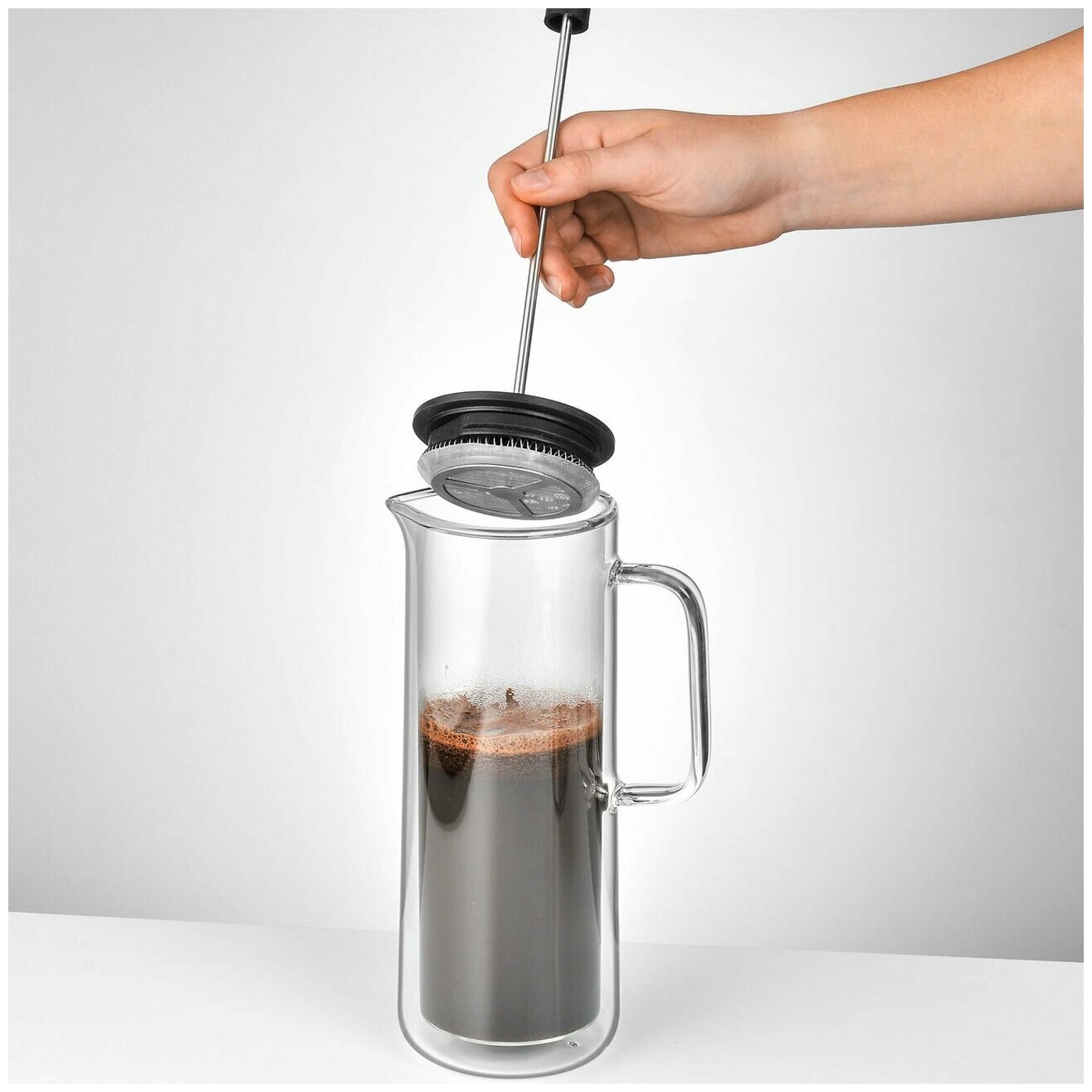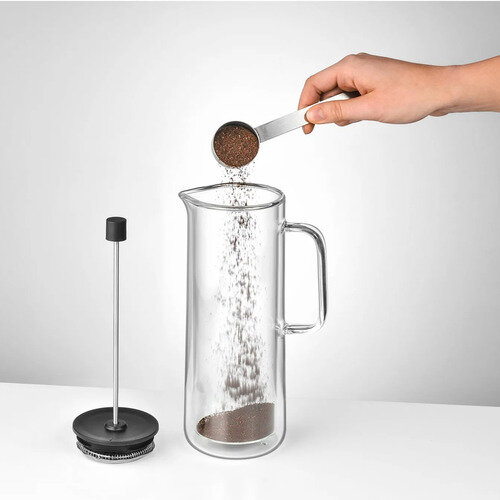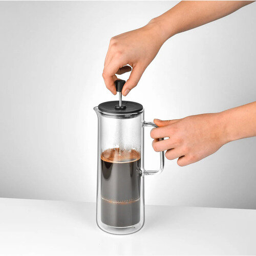 Заваривать кофе в таком френч-прессе очень просто: положите желаемое количество молотого кофе в кофейник и налейте в него горячую воду, дайте кофе немного постоять, а затем медленно нажмите на пресс, опуская его до конца.