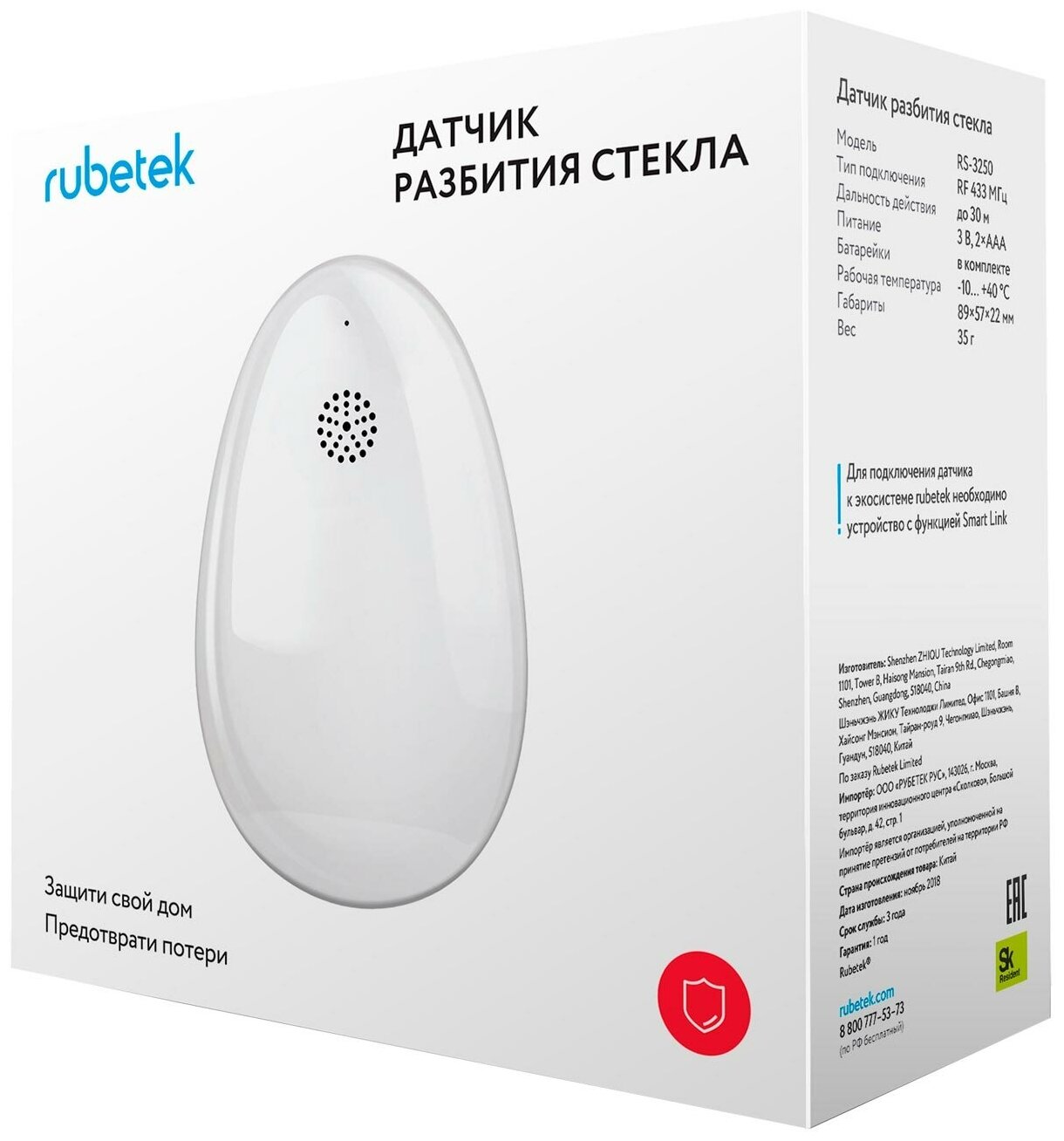 Датчик разбития стекла Rubetek используется для охраны домов, квартир и офисов, особенно если они размещены на нижних этажах. Модель RS-3250 обеспечивает быструю реакцию в случае повреждения стекла, информируя владельца недвижимости о попытке проникновения внутрь через окно. Работает вместе со специальным мобильным приложением, установка которого является обязательной при эксплуатации устройства.