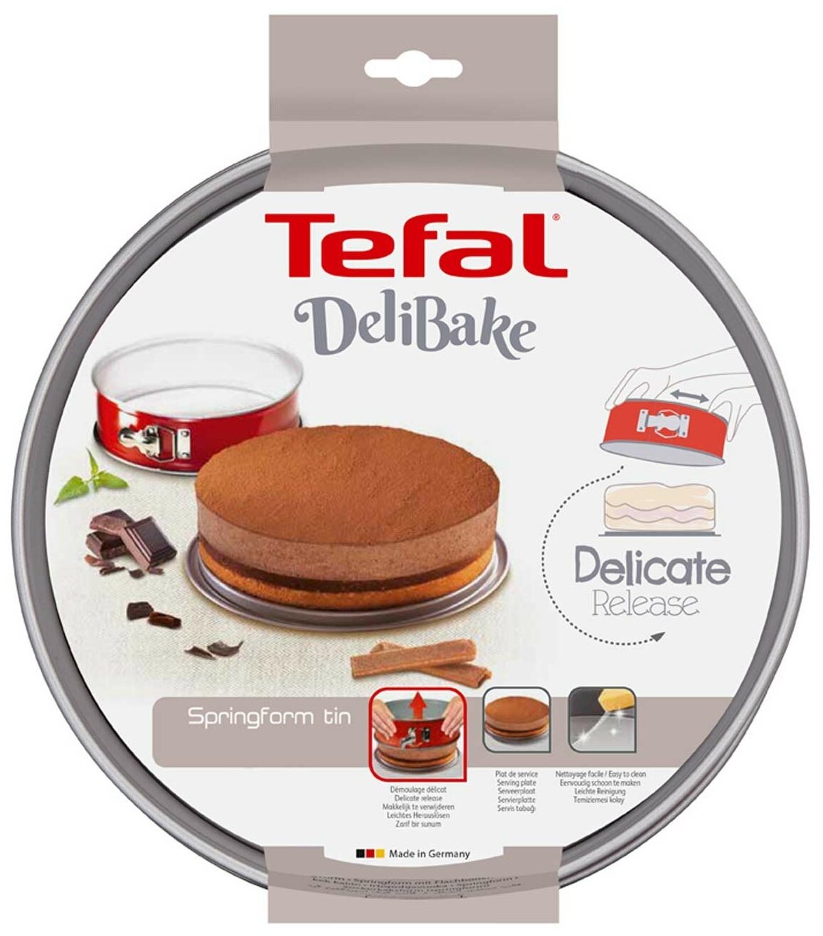 Круглая форма для выпекания Tefal Delibake – хороший выбор для того, кто любит и умеет готовить. Она изготовлена из прочной стали и превосходно выдерживает как высокую, так и низкую температуру. За счёт этого её можно ставить не только в СВЧ-печь или духовку, но и в холодильник либо морозильник. Эта модель оборудована съёмным дном, поэтому вы без труда достанете из неё пирог или кекс. На внутренние стенки нанесено антипригарное покрытие, а это значит, что продукты не прилипают, блюда получаются безупречно вкусными, и после использования изделие легко отмывается под струёй воды или в посудомоечной машине.