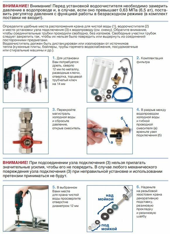 | ВКоробке | Фильтр - 1 шт. Картридж - 3 шт. Кран для чистой воды - 1 шт. Пластиковая трубка - 1 шт. Инструкция - 1 шт. |