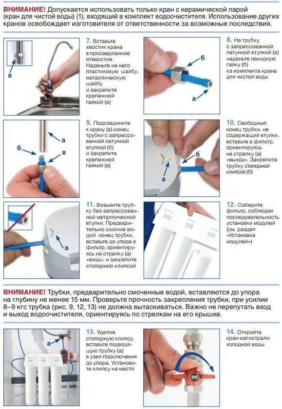 Уникальный фильтр, не имеющий аналогов на российском рынке. Очищая воду от вредных примесей, бережно заботится о здоровье Вашей семьи. Фильтр надежно удаляет механические примеси, коллоидное железо, активный хлор, тяжелые металлы, органические вещества и многие другие загрязнители. Кроме того, обеспечивает 100% защиту от бактерий, без бактерицидных добавок и химических реагентов. Использование уникальной половолоконной мембраны японского производства позволяет "отсекать" опасные микроорганизмы механически, надежно и безопасно. Благодаря эргономичному "слим" дизайну фильтр займет минимум места под мойкой. Его легко разместить даже на малогабаритной кухне. Удобство фильтра также превосходит аналоги: благодаря особым креплениям, замена модулей требует минимум времени и сил. Кроме того, модуль заменяется вместе с корпусом, что предотвращает попадание бактерий при замене.Комплектация 1.Модуль К3 2.Модуль К7B 3.Модуль К7 4.Блок коллекторов 5.Соединительная трубка 6.Соединительная трубка со вставленной конической втулкой 7.Узел подключения 8.Кран для чистой воды 9.Заглушка 10.Ключ-вилка 11.Руководство по эксплуатации 12.Комплект упаковки