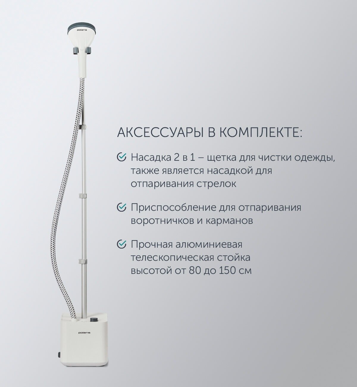 | Прочие особенности и свойства | Идеальное решение для ухода за деликатными тканями и одеждой сложного кроя., Готовность к работе через 35 сек., Постоянный пар высокой мощности до 45 г/мин., 2 режима отпаривания для различных типов ткани., Съемный бак со шкалой уровня воды объемом 1.6 л., Система очистки от накипи., Режимы работы: вертикальное отпаривание., Безопасен для всех типов ткани., Подходит для использования проточной воды., Использование без гладильной доски., Аксессуары в комплекте:, - Насадка для отпаривания стрелок;, - Насадка-щетка для чистки одежды;, - Насадка для отпаривания воротничков и карманов;, - Прочная алюминиевая телескопическая стойка высотой от 80 до 150 см. |