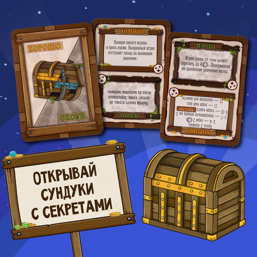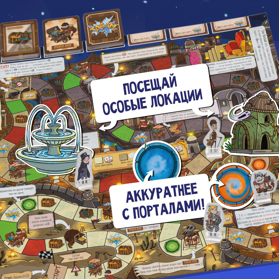 В пути подстерегают как опасности и ловушки, так и необычайное везение. Коварные порталы, которые могут сэкономить время или отправить на полкарты назад. Проклятая шахта, которая может надолго задержать или подать победу на блюдечке. Карты Тадам, меняющие правила игры буквально на ходу.