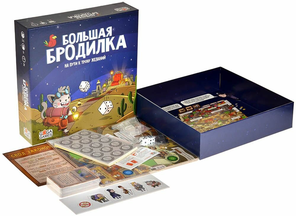 | Комплектация | игровое поле; 59 карт; 90 жетонов монет; 5 персонажей; 5 подставок под персонажей; 2 кубика; свод законов |