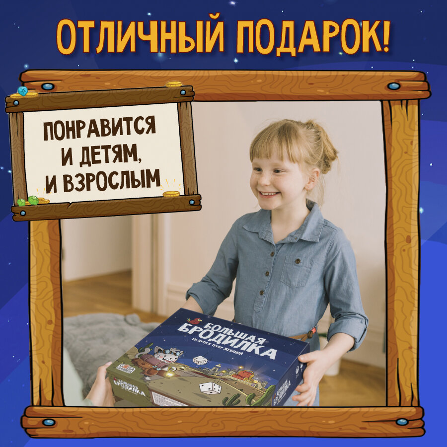 Играть одинаково весело и в компании побольше, и даже вдвоем. А крутая мультяшная рисовка Бродилки — дело рук петербургского художника-комиксиста Владимира Лопатина. Веселые иллюстрации, полное отсутствие правил и азартная механика превращают Большую Бродилку в любимицу всех возрастов и поколений. Отличная игра, которая подойдет как для уютного семейного вечера, так и для веселой компании друзей.