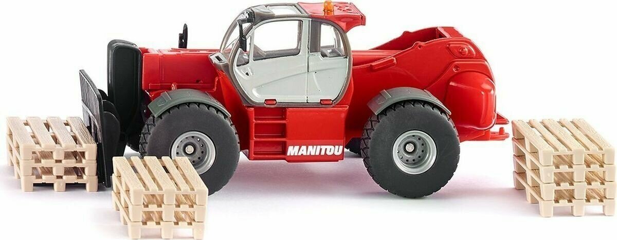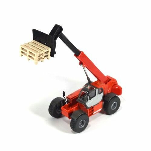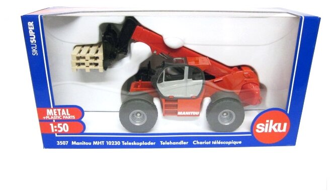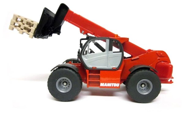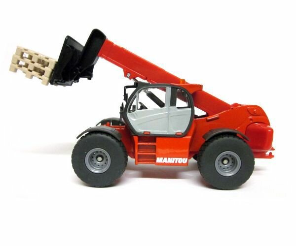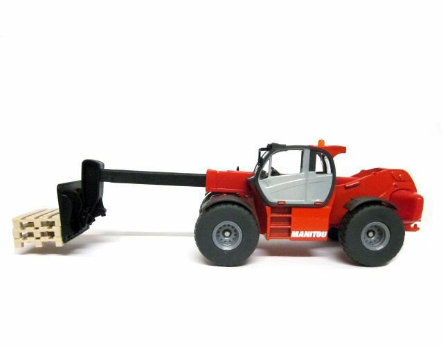 Погрузчики MHT 10230 является новейшей моделью от Manitou, это самый крупный погрузчик. Модель погрузчика с массивными колесами и мощным корпусом выполнена детально и аккуратно. Рычаг погрузчика с анкерной вилкой подвижен, может подниматься и выдвигаться вперед. Корпус погрузчика выполнен из металла и пластика, колёса выполнены из резины и вращаются, модель можно катать. Сзади погрузчик оборудован сцепным устройством, его можно использовать с различными прицепами в масштабе 1:50. Также в комплекте с погрузчиком идет три игрушечных палета.