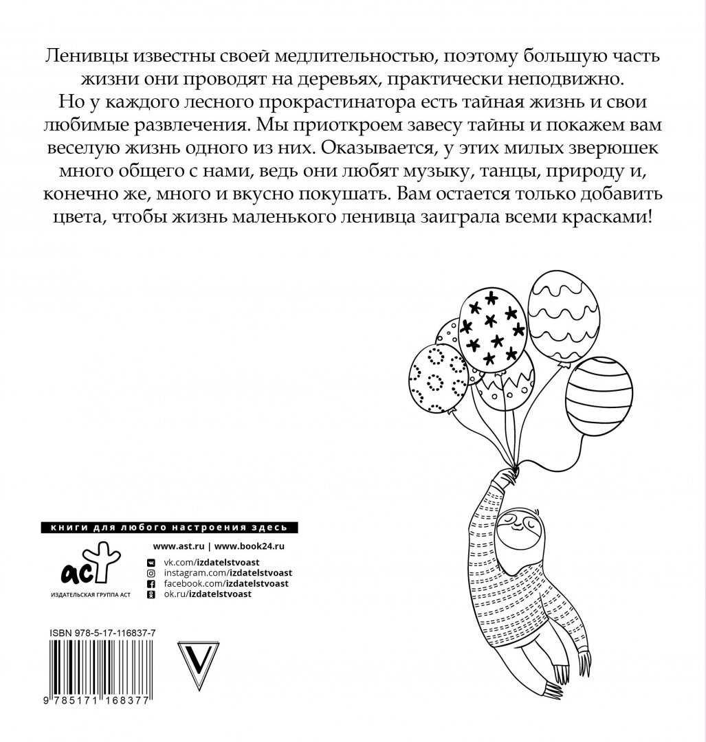 Ленивцы известны своей медлительностью, поэтому большую часть жизни они проводят на деревьях, практически неподвижно. Но у каждого лесного прокрастинатора есть тайная жизнь и свои любимые развлечения. Мы приоткроем завесу тайны и покажем вам веселую жизнь одного из них. Оказывается, у этих милых зверюшек много общего с нами, ведь они любят музыку, танцы, природу и, конечно же, много и вкусно покушать. Вам остается только добавить цвета, чтобы жизнь маленького ленивца заиграла всеми красками!