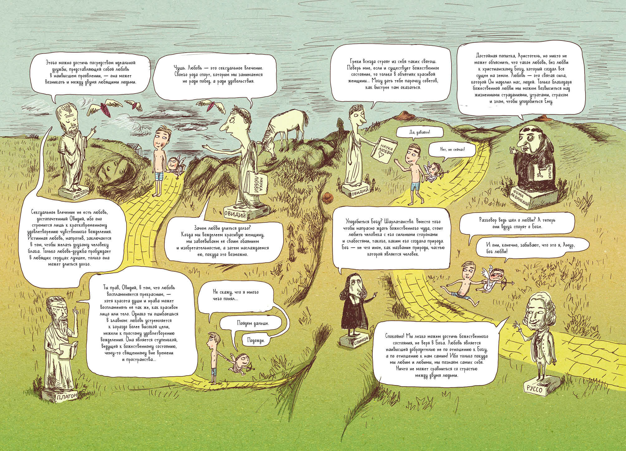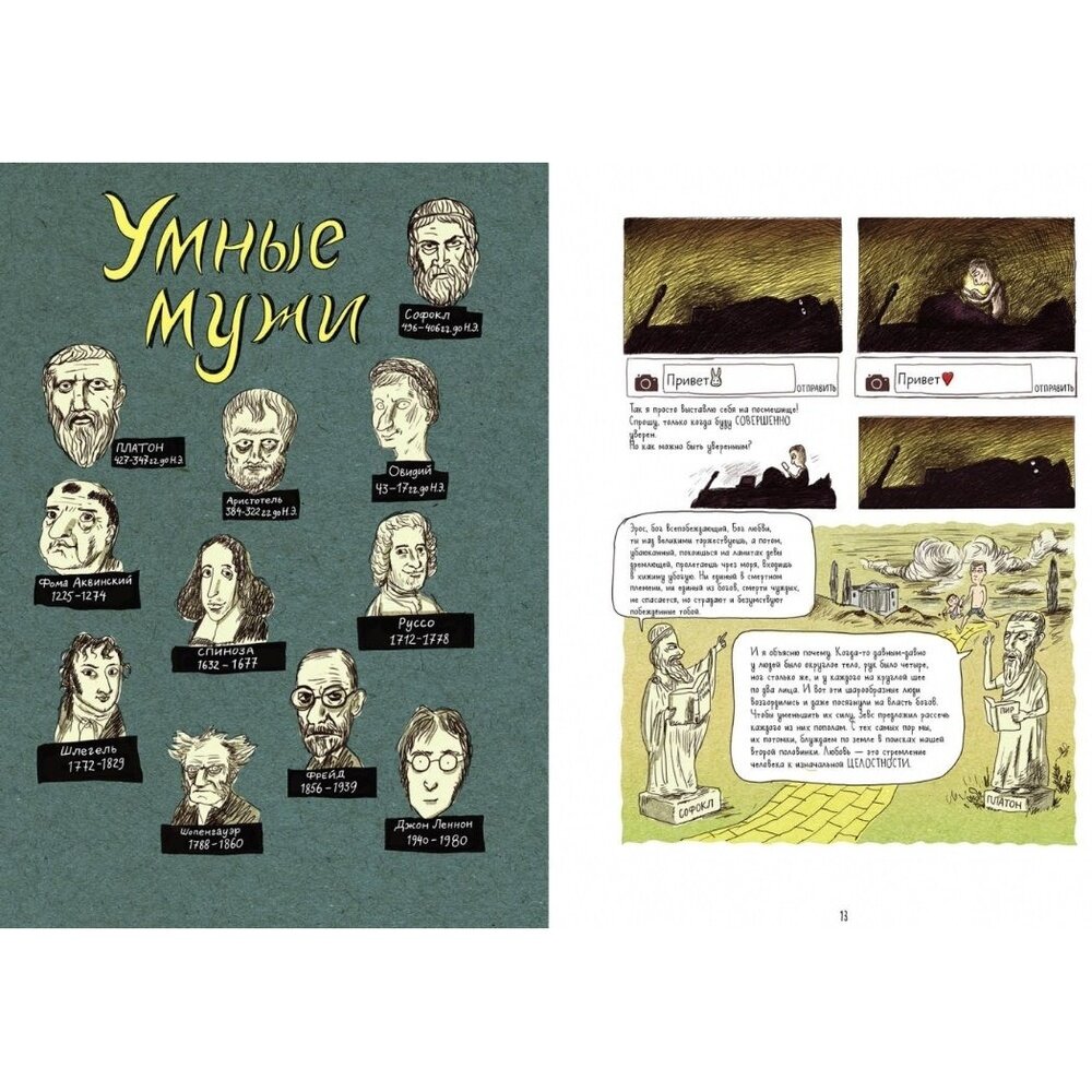 Мне книжка тоже понравилась от и до. Во-первых, она вызвала у меня неплохую такую и приятную ностальгию. Во-вторых, истории рассказаны с хорошей дозой юмора и доброй иронии (можно сказать, самоиронии, ведь авторы тоже это переживали в свое время). В-третьих, здорово, что переживания первой любви показаны с обеих сторон: то, что чувствуют девочки и то, что ощущают мальчики - это супер актуально для подростков, которые только учатся понимать противоположный пол. А еще, на мой взгляд, там проскальзывает очень важная тема того, что чаще всего поведение человека зависит от каких-то его внутренних или внешних обстоятельств, то есть нужно быть как можно менее мнительным и не привязывать все поступки других людей к себе, а так и жить легче к тому же. А вообще комикс ужасно милый и трогательный, а еще и познавательный: там есть забавные эпизоды, в которых фигурируют всякие философы и мыслители, а также классическая литература.