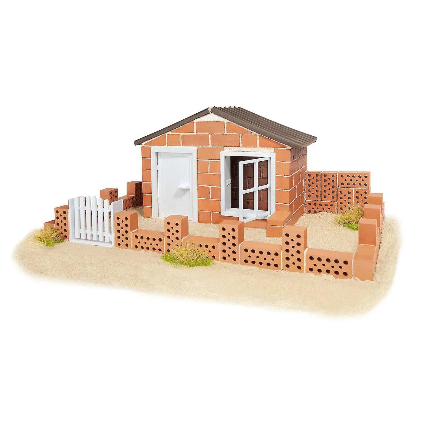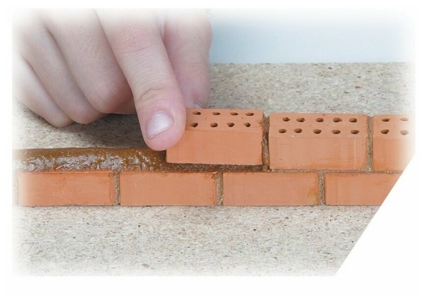 | Комплектация | глиняные кирпичики, строительная смесь, миска, мастерок, коврик, пластиковые элементы — оконные рамы, калитки, двери, инструкция |