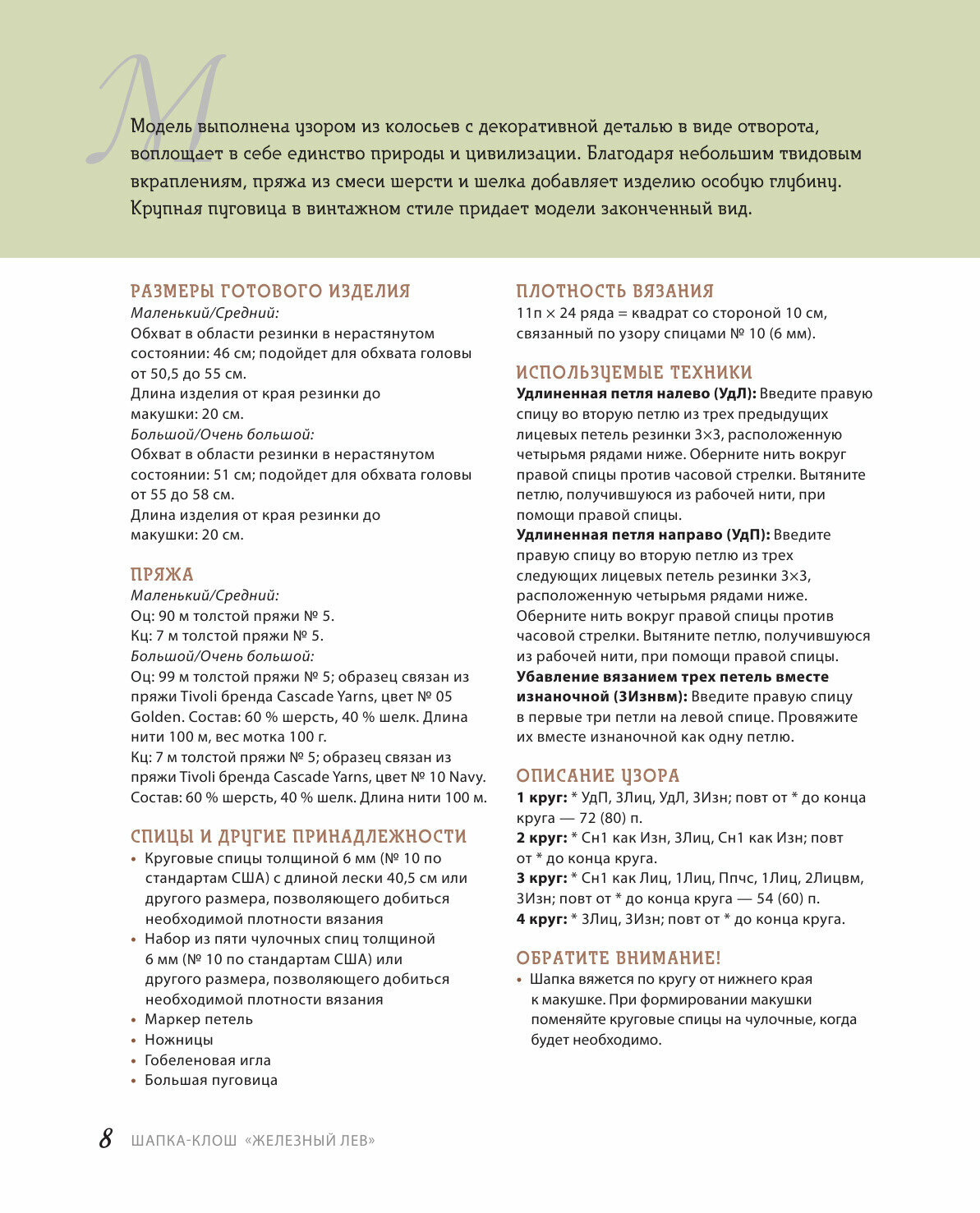 Шапки и другие головные уборы в нашем климате не роскошь, а необходимость. Поэтому они никогда не выйдут из моды. Но как хочется серой и холодной зимой, чтобы шапка была модной, оригинальной, небанальной! Американский дизайнер Дайан Сервисс предлагает большую коллекцию новых и модных дизайнов самых разнообразных головных уборов с подробными описаниями, схемами, авторскими советами и прекрасными иллюстрациями! Найдутся модели и для молодежи, и для людей в возрасте, и для тех, кто предпочитает экстравагантность, и для убежденных консерваторов. Объединяет их одно: все они актуальны, свежи и просто красивы! Шапочки-бини, береты, капюшоны и даже кепки - огромное разнообразие ультрамодных моделей на любой вкус для вязальщиц любого уровня!