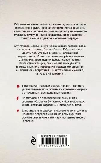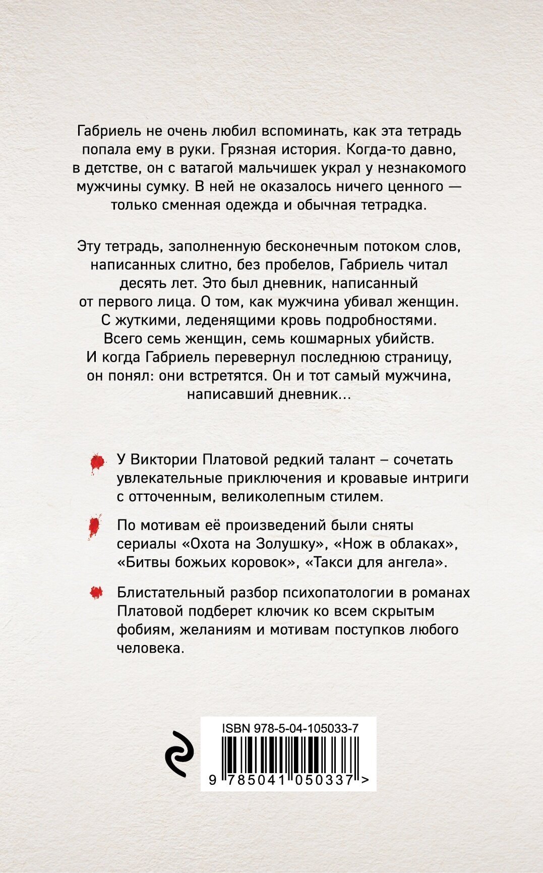 Эту тетрадь, заполненную бесконечным потоком слов, написанных слитно, без пробелов, Габриель читал десять лет. Это был дневник, написанный от первого лица. О том, как мужчина убивал женщин. С жуткими, леденящими кровь подробностями. Всего семь женщин, семь кошмарных убийств. И когда Габриель перевернул последнюю страницу, он понял: они встретятся. Он и тот самый мужчина, написавший дневник…