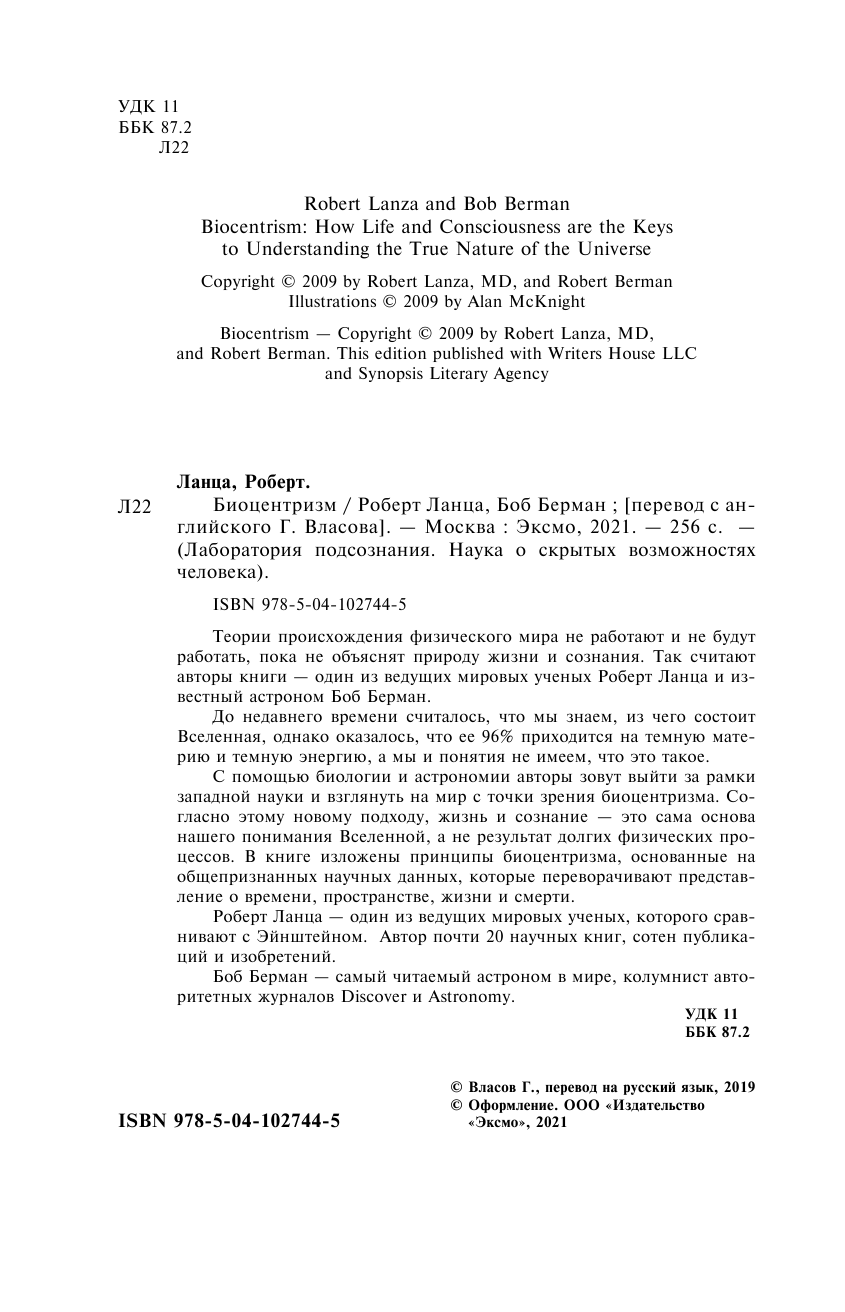 Теории происхождения физического мира не работают и не будут работать, пока не объяснят природу жизни и сознания. Так считают авторы книги - один из ведущих мировых ученых Роберт Ланца и известный астроном Боб Берман.