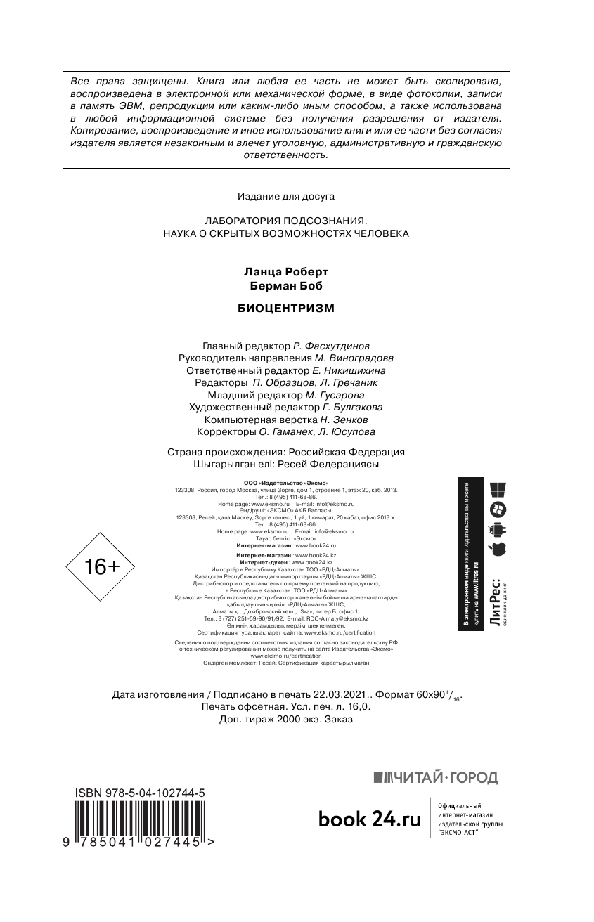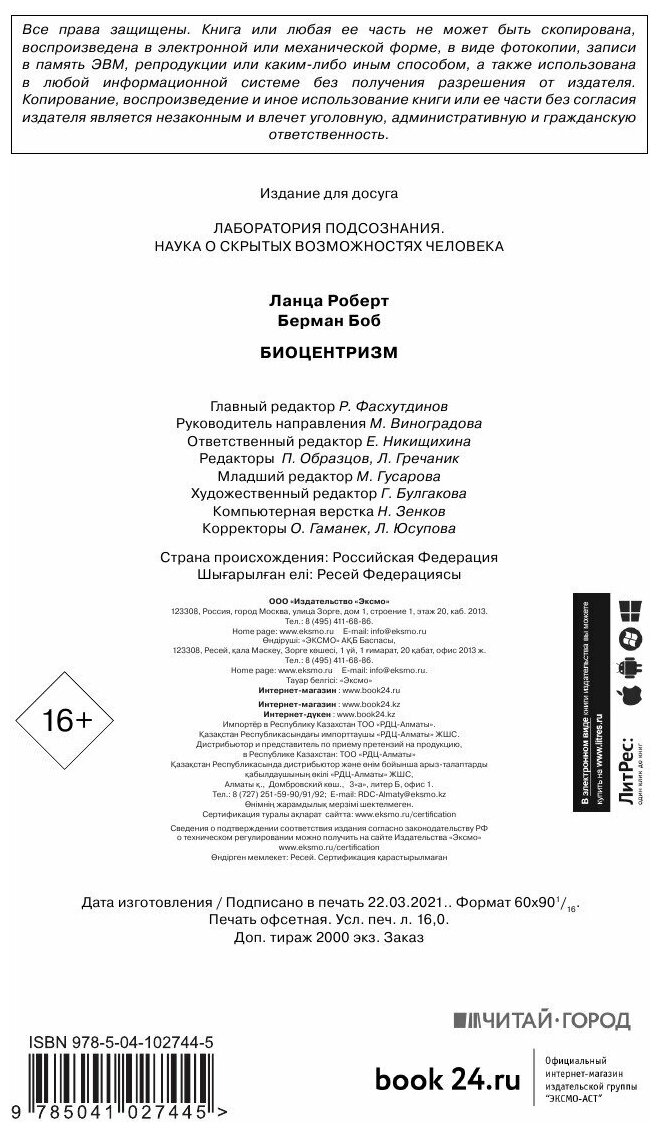 На сегодняшний день товар «Книга: Биоцентризм (Роберт Ланца, Берман Боб); Бомбора, 2021» можно купить с кешбеком в 1 магазине: book24