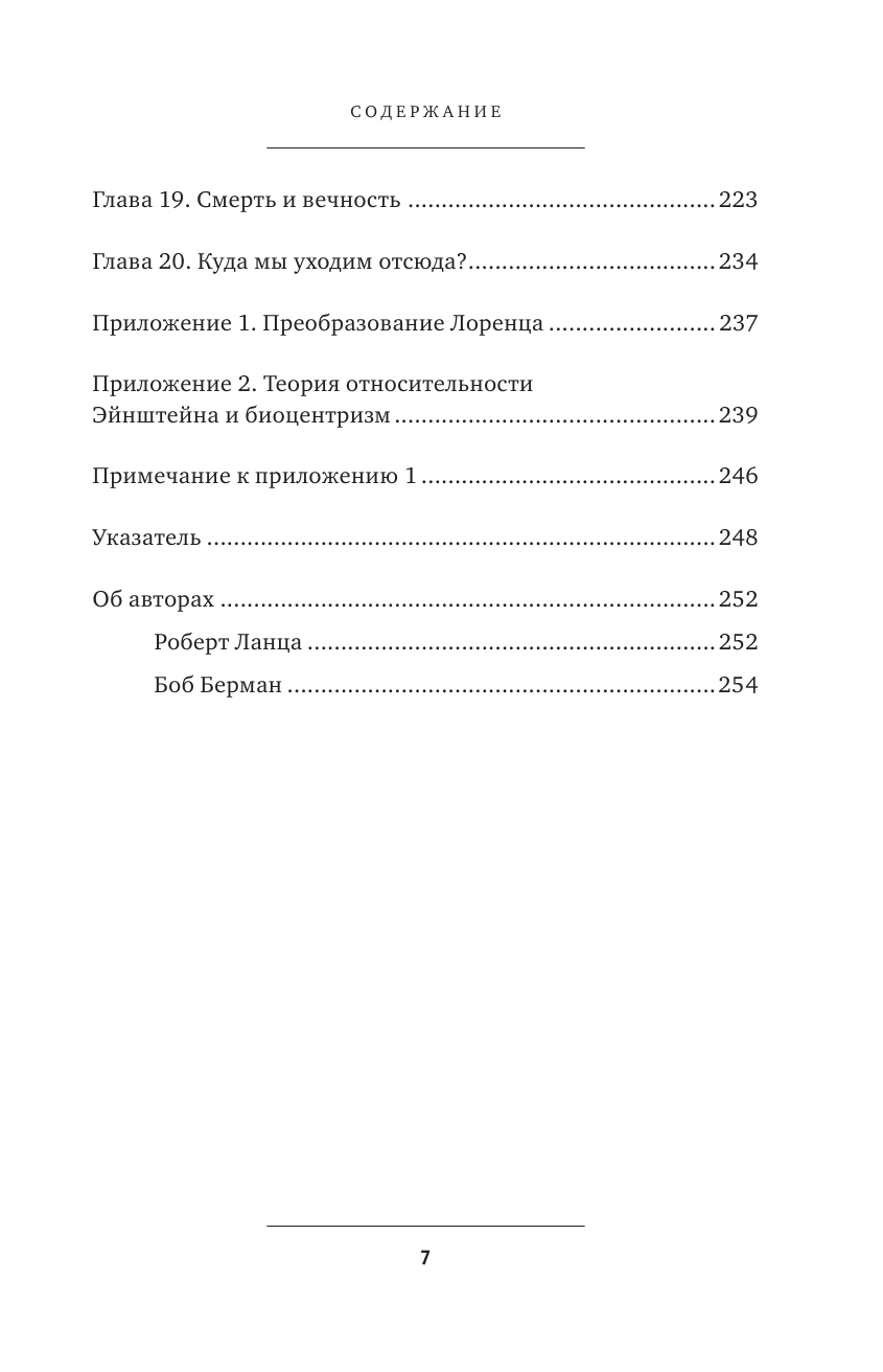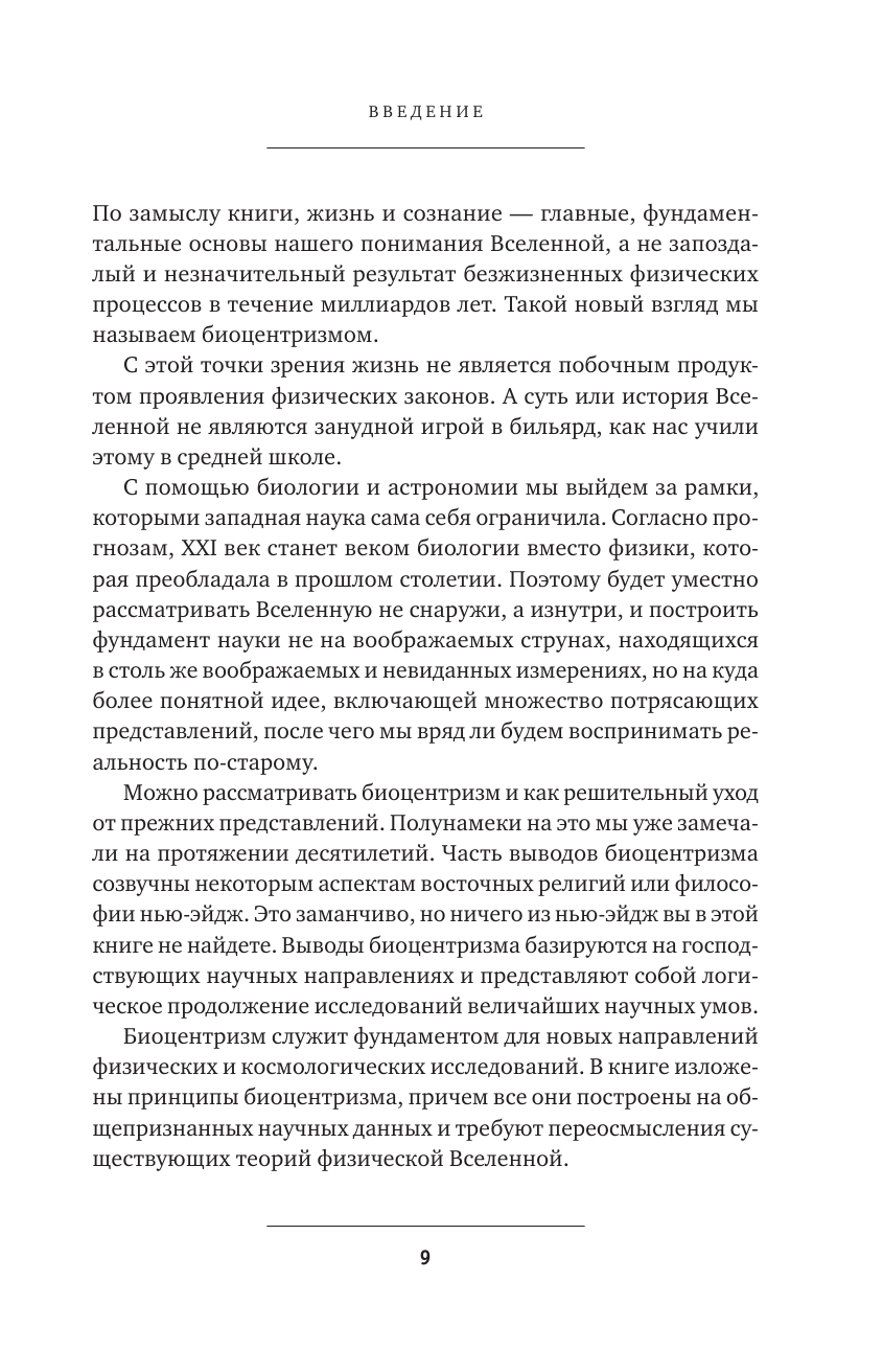 С помощью биологии и астрономии авторы зовут выйти за рамки западной науки и взглянуть на мир с точки зрения биоцентризма. Согласно этому новому подходу, жизнь и сознание - это сама основа нашего понимания Вселенной, а не результат долгих физических процессов. В книге изложены принципы биоцентризма, основанные на общепризнанных научных данных, которые переворачивают представление о времени, пространстве, жизни и смерти.