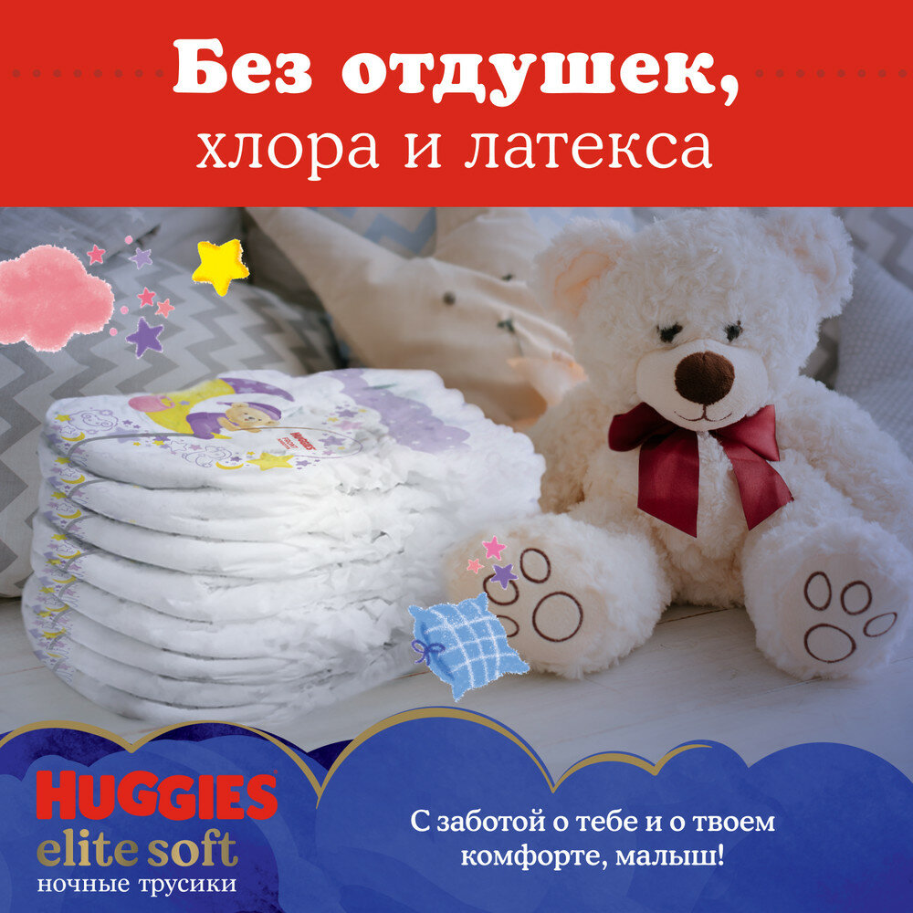 Новые ночные трусики подгузники для сна Huggies Elite Soft специально созданы для заботы о коже малыша всю ночь! Благодаря наличию усиленного впитывающего слоя, кожа малыша будет надежно защищена всю ночь, а мягкие и дышащие материалы подгузника обеспечат максимальную заботу о ней. Усиленный впитывающий слой для сохранения сухости подгузника всю ночь. Мягкий эластичный 2-зонный цельный поясок для отличной посадки и комфортного сна. Легко надеть – просто натяните трусики. Легко снять – разорвите боковой шов. Липучка для удобной утилизации закрывает запах на замок. Особые материалы позволяют воздуху циркулировать, чтобы кожа малыша оставалась сухой. Индикатор влаги подскажет, когда придет время сменить трусики. Новый ночной дизайн с героем DisneyПодходят для мальчиков и девочек.