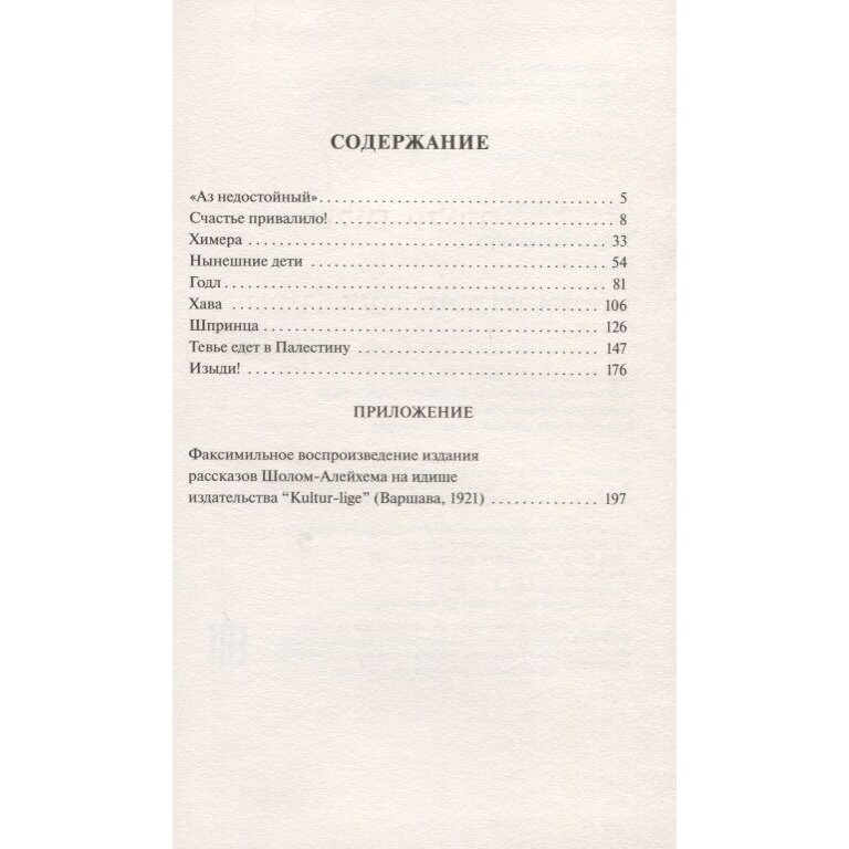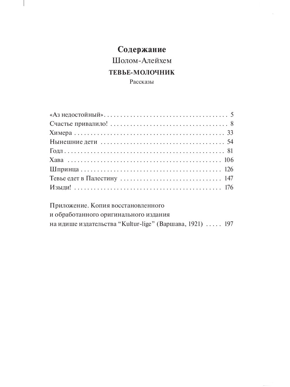 В Приложении к изданию размещена факсимильная копия книги Тевье-молочник варшавского издательства Kultur-lige 1921 года. Предлагаем вам открыть первую страницу и окунуться в удивительный, живой и объемный мир Шолом-Алейхема - автора, к которому хочется возвращаться снова и снова...